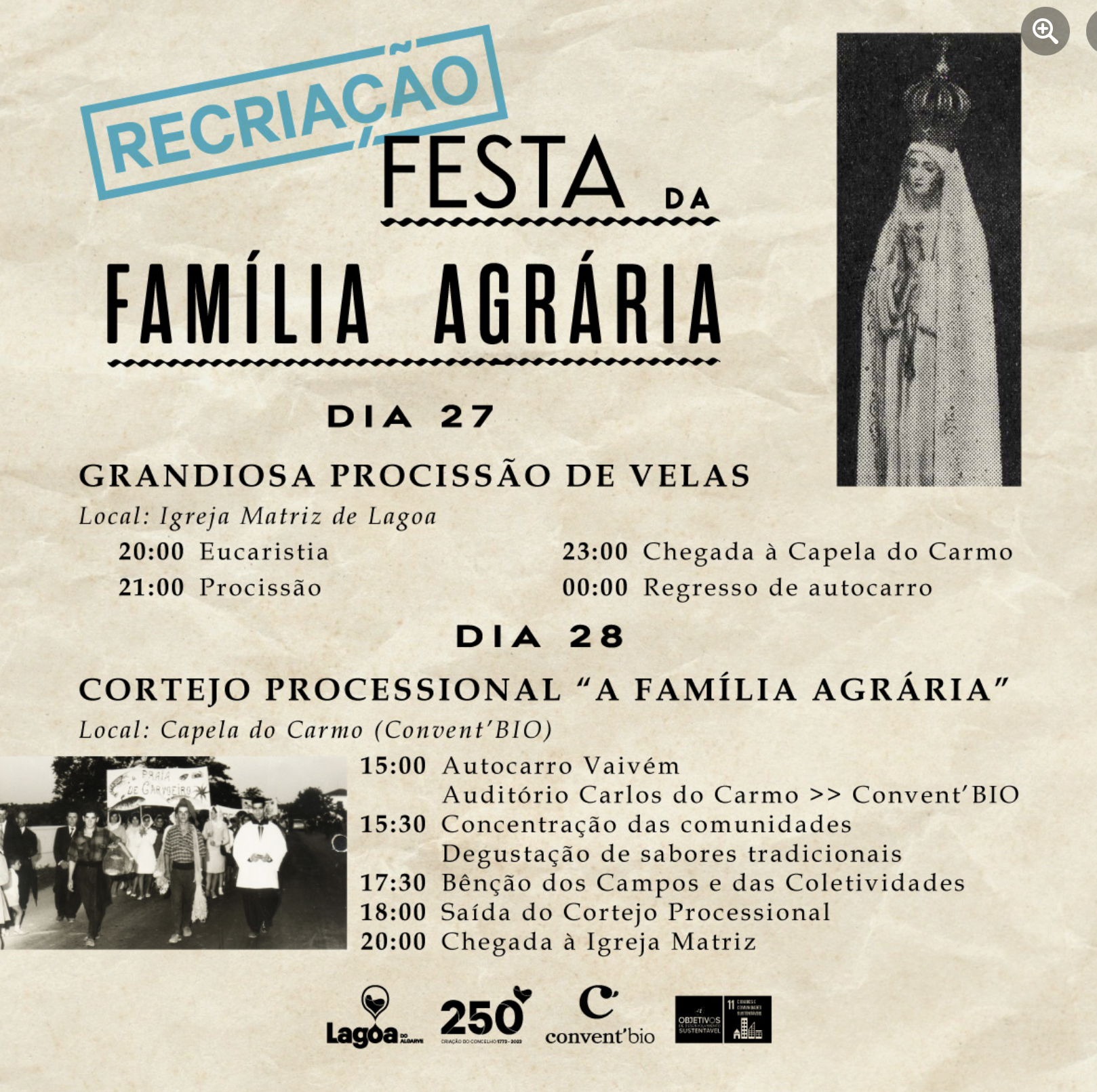 Assim, no dia 27 de maio realiza-se a Grandiosa Procissão de Velas, que partirá da Igreja Matriz de Lagoa, pelas 20h00, e terá como ponto de chegada a Capela do Carmo. No dia 28 de maio, tem lugar o Cortejo Processional “A Família Agrária”, que sairá da Capela do Carmo, pelas 18h00, e terminará na Igreja Matriz de Lagoa.