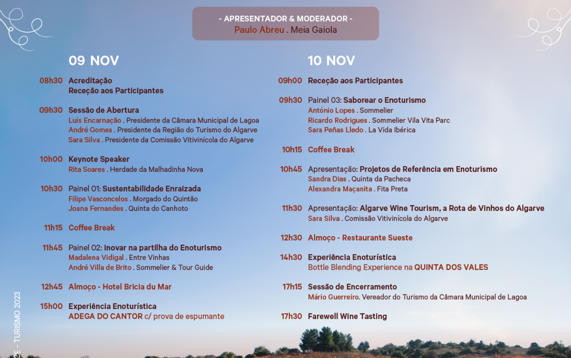Sob o tema Innovation & Sustainability Challenges, nos dois dias do encontro serão abordados temas como o impacto deste segmento de turismo enquanto potenciador de destinos, exemplos de casos de sucesso e perspetivas e novas tendências do mercado. Entre os oradores destaca-se a presença de Rita Soares, da Herdade da Malhadinha Nova, Sara Silva, Presidente da Comissão Vitivinícola do Algarve, Luís Encarnação, Presidente da Câmara Municipal de Lagoa, e André Gomes, Presidente do Turismo do Algarve.