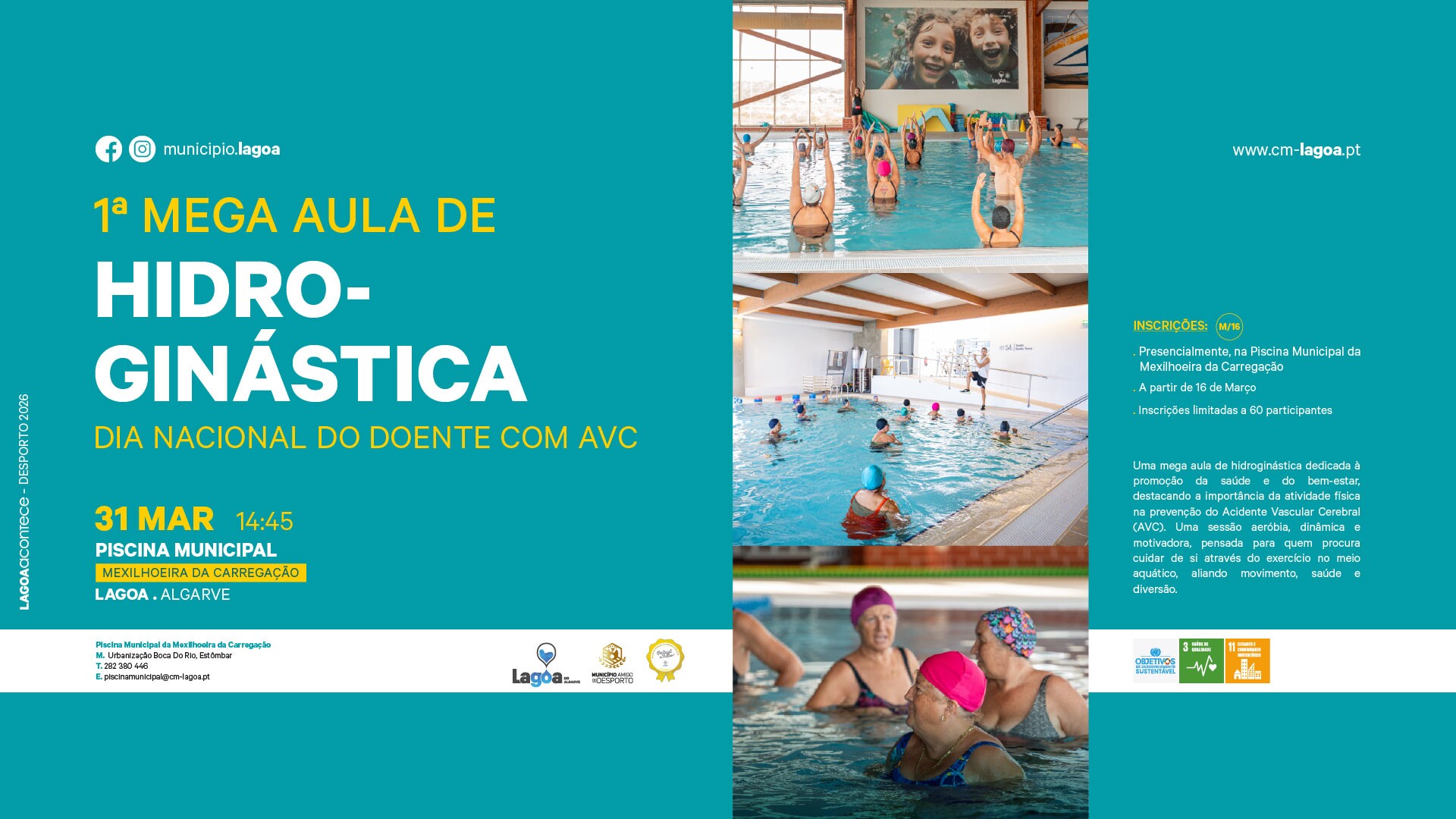 No dia 31 de março, a Piscina Municipal da Mexilhoeira da Carregação recebe a 1.ª Mega Aula de Hidroginástica, uma sessão especial que assinala também o Dia Nacional do Doente com AVC.