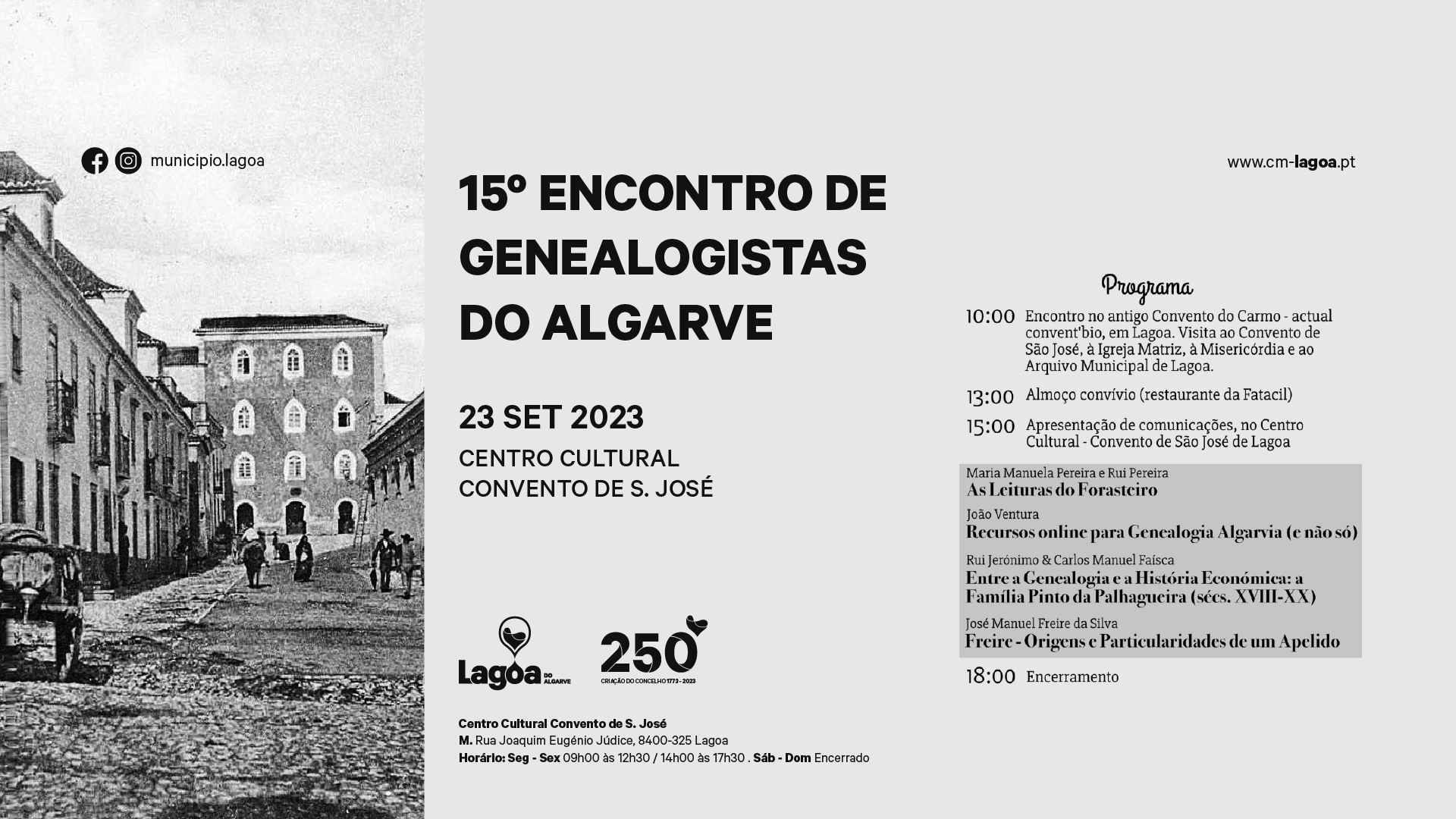No ano em que se assinalam 250 anos da fundação do concelho de Lagoa, o Município irá acolher o 15.º Encontro de Genealogistas do Algarve, no próximo dia 23 de setembro, sábado, no auditório do Centro Cultural Convento de S. José.