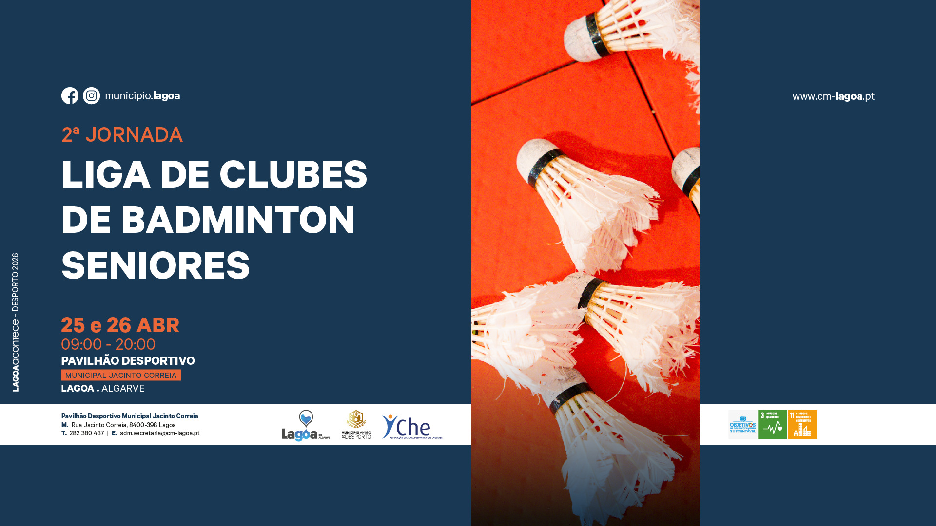 O Pavilhão Desportivo Municipal “Jacinto Correia” recebe, nos dias 25 e 26 de abril, entre as 🕘 09h00 e as 20h00, a 2.ª Jornada da Liga de Clubes de Badminton – Seniores, um momento marcante do calendário competitivo nacional.