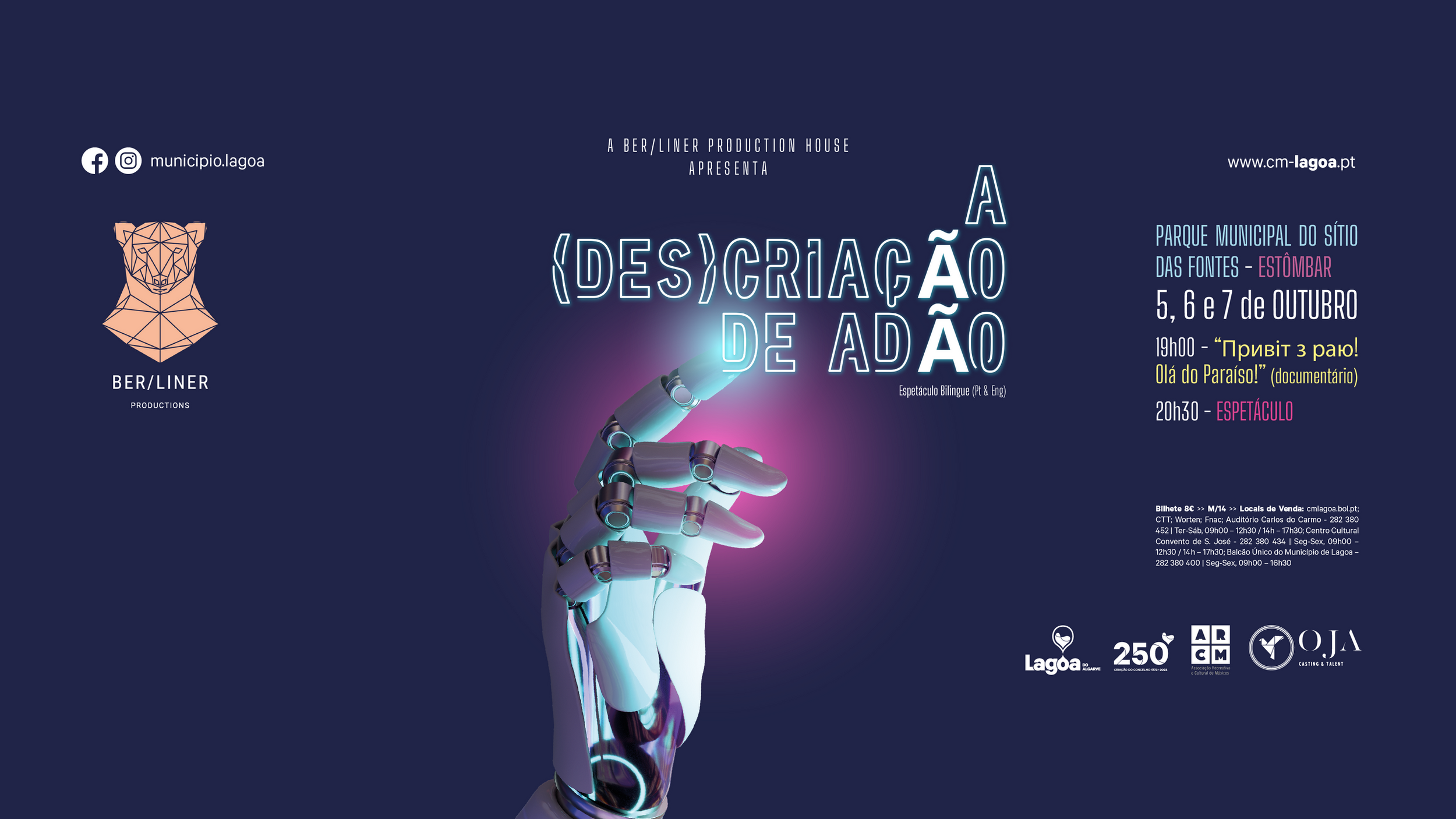 O Parque Municipal do Sítio das Fontes, em Estômbar, recebe nos dias 05, 06 e 07 de outubro o espetáculo “A (Des)Criação de Adão”, uma produção da Ber/Liner Production House. A anteceder este espetáculo está o documentário “Привіт з раю! / Оlá do Paraíso!”.