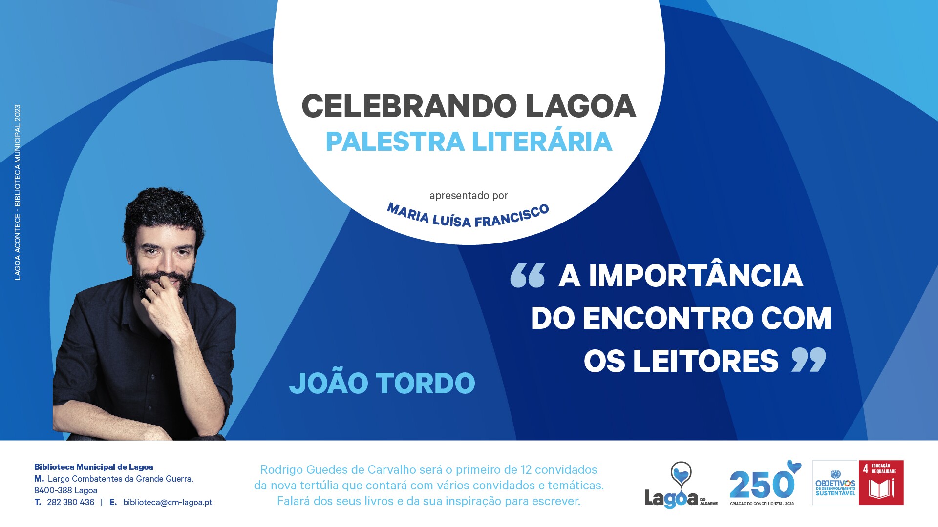 No dia 28 de julho, pelas 18h00, a Biblioteca Municipal de Lagoa recebe, na Sala Polivalente da Biblioteca, a Palestra Literária “A importância do Encontro com os Leitores”, com o Escritor e Argumentista João Tordo e apresentado por Maria Luísa Francisco.