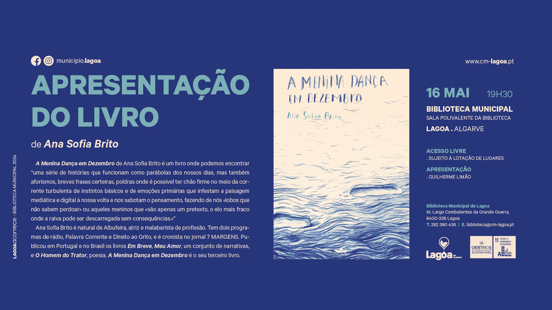 A Sala Polivalente da Biblioteca Municipal de Lagoa, recebe a Apresentação Pública do Livro A Menina Dança em Dezembro, de Ana Sofia Brito, no próximo dia 16 de maio, pelas 19h30 e a entrada é livre.
