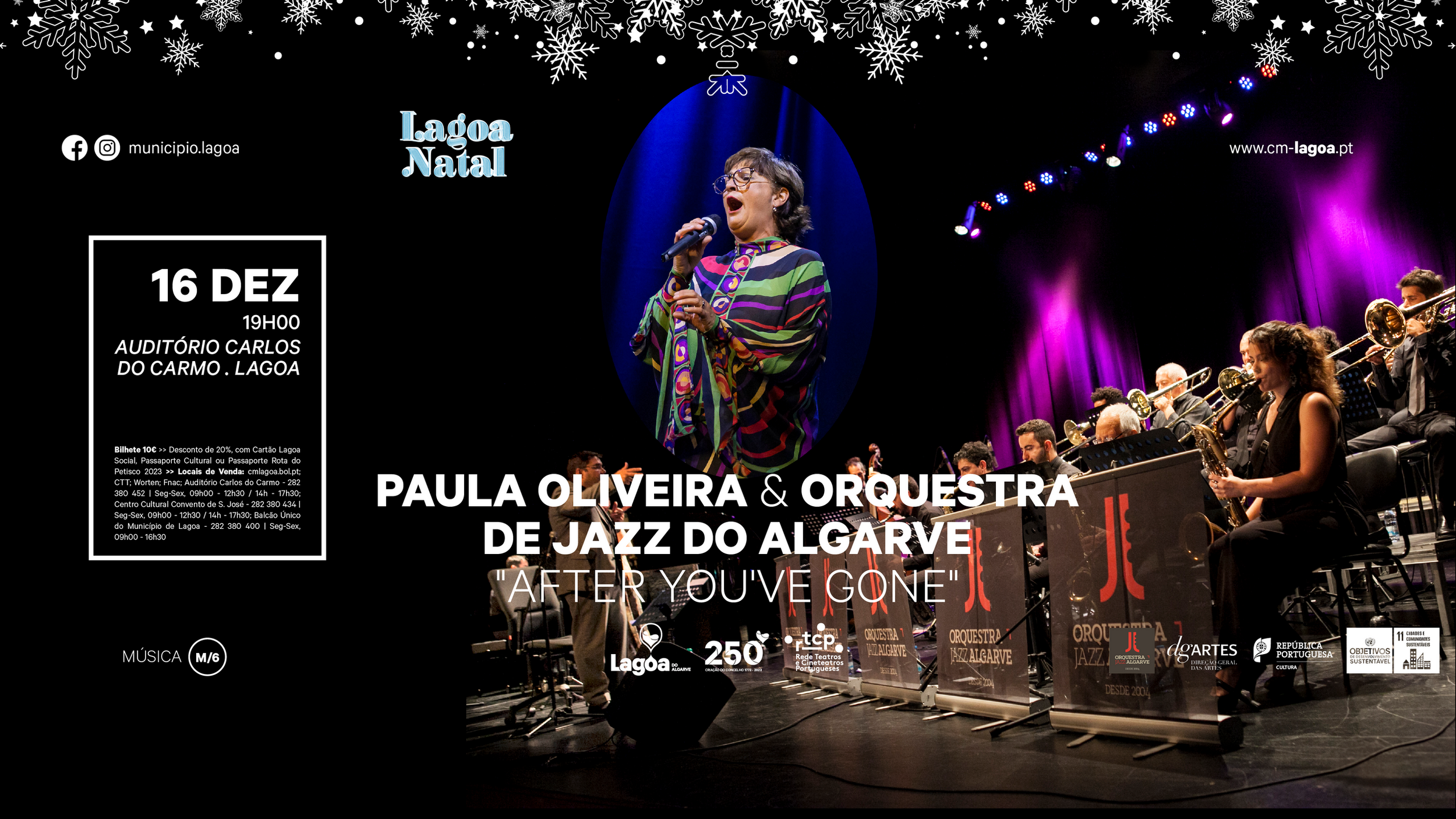 O Auditório Carlos do Carmo volta a receber a Orquestra de Jazz do Algarve, a última visita de 2023, com o concerto “After You’ve Gone” que conta com a cantora-jazz Paula Oliveira, como convidada especial deste espetáculo. O concerto será no dia 16 de dezembro, sábado, pelas 19h00 e os bilhetes já se encontram à venda.