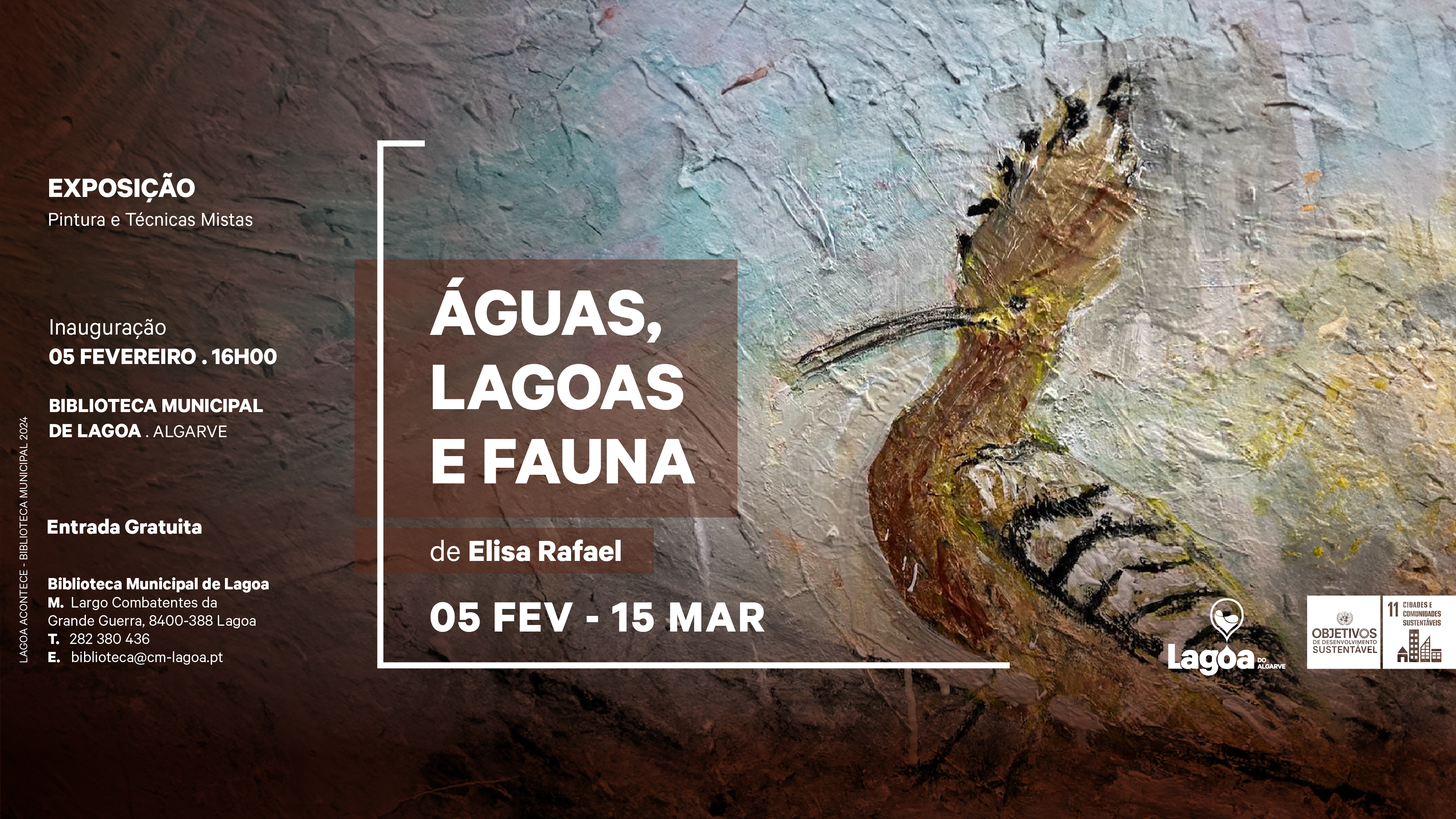 Sinopse: “𝗔́𝗴𝘂𝗮𝘀, 𝗟𝗮𝗴𝗼𝗮𝘀 𝗲 𝗙𝗮𝘂𝗻𝗮” é uma exposição de trabalhos de pintura com técnicas mistas de Elisa Rafael que configura a sua representação da paisagem natural e humana, assim como a fauna do concelho de Lagoa.