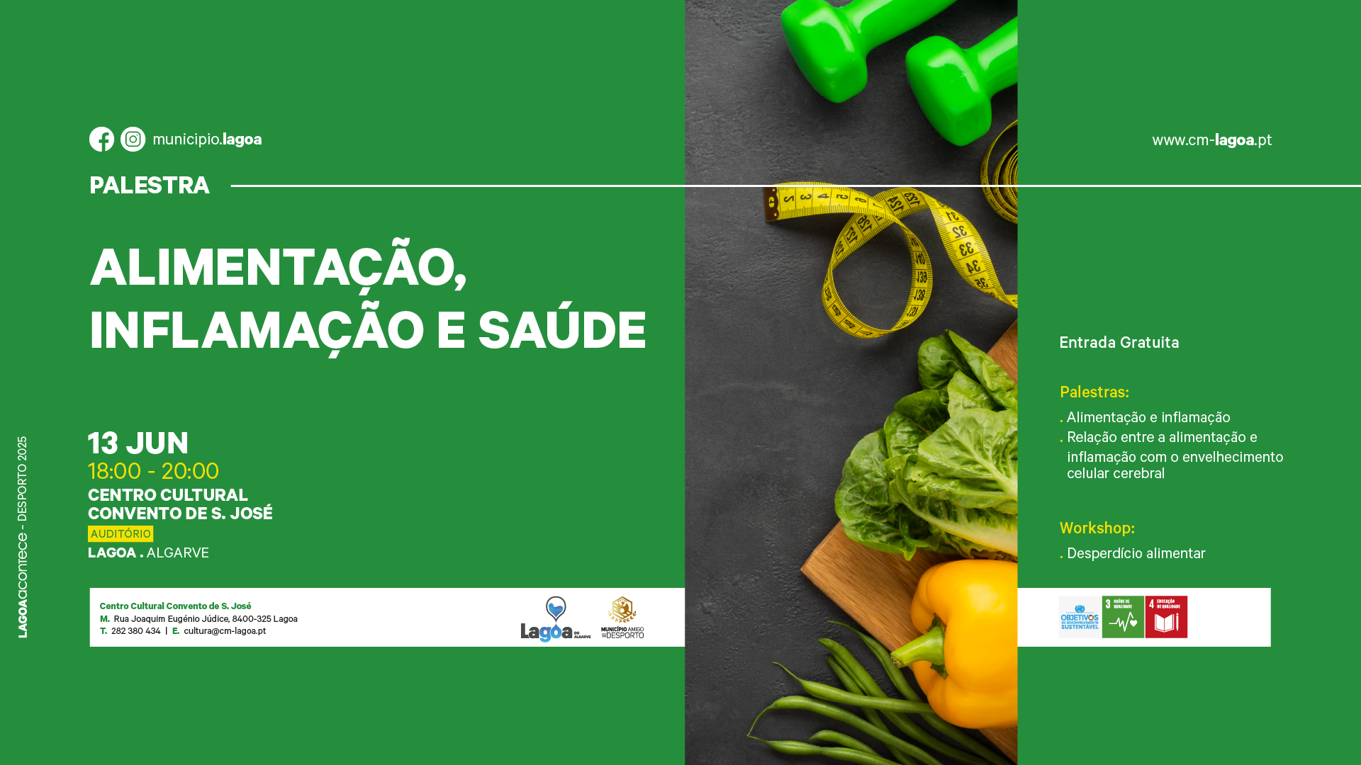 No dia 13 de junho, pelas 18h00, o Centro Cultural Convento de S. José recebe a atividade 🍔Alimentação, Inflamação e Saúde💊, que consiste na realização de duas palestas: Alimentação e Inflação; Relação entre a alimentação e inflamação com o envelhecimento celular cerebral e ainda no workshop: Desperdício alimentar. A participação é gratuita.