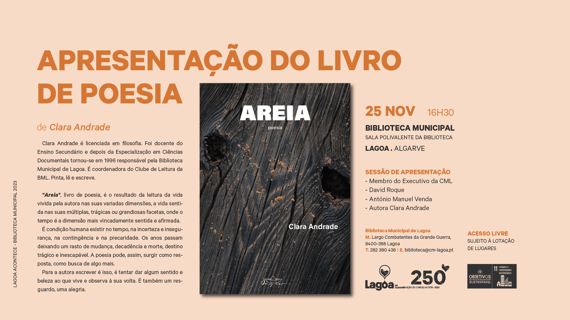 No dia 25 de novembro, pelas 16h30, a Sala Polivalente da Biblioteca Municipal de Lagoa, recebe a apresentação pública do Livro “Areia”, de Clara Andrade. Esta sessão será apresentada por David Roque e é de acesso livre.