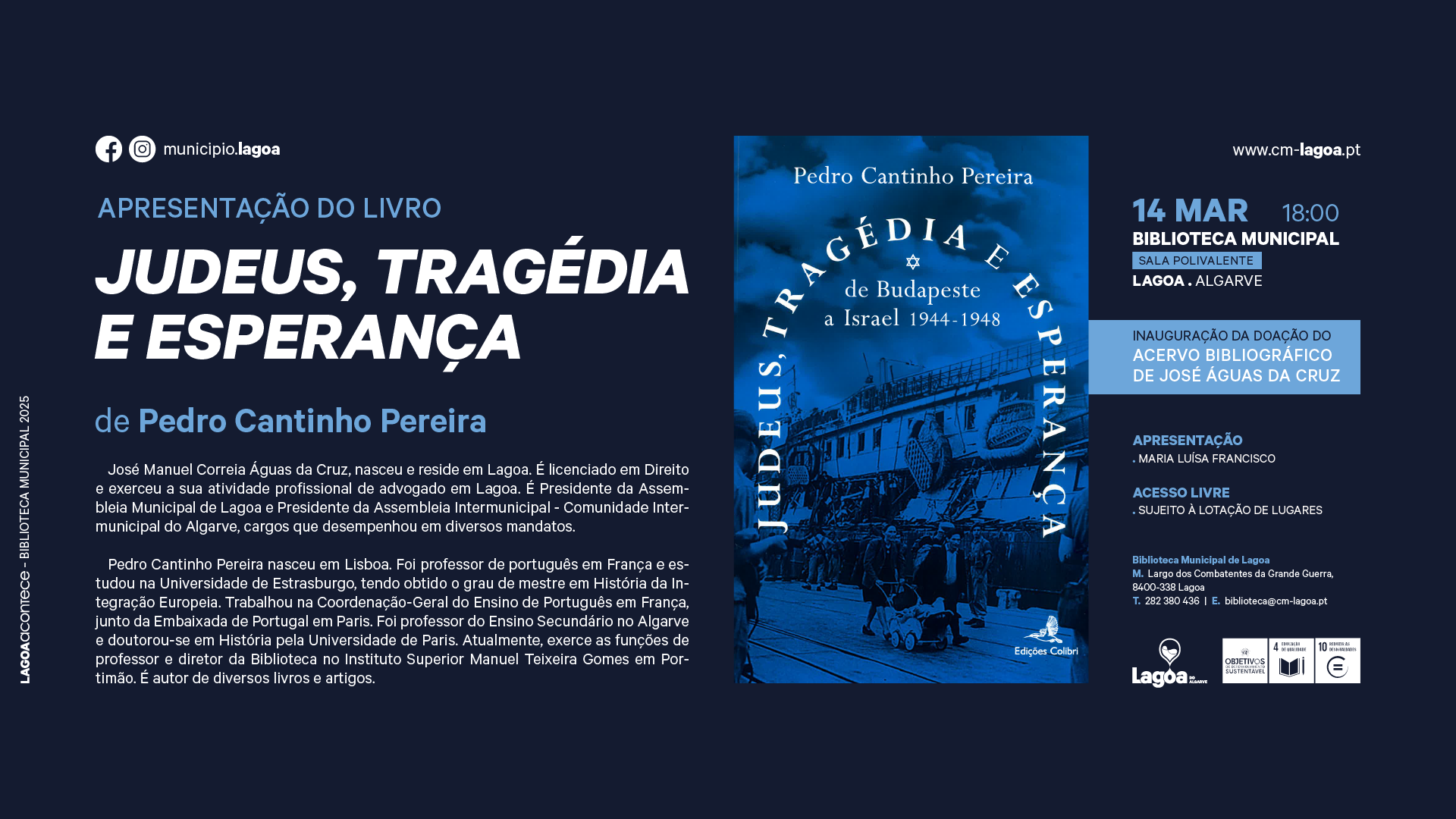 A Biblioteca Municipal de Lagoa recebe, no dia 14 de março, pelas 18h00, a Apresentação do Livro 📚Judeus, Tragédia e Esperança📘, de Pedro Cantinho Pereira, com apresentação de Maria Luísa Francisco.