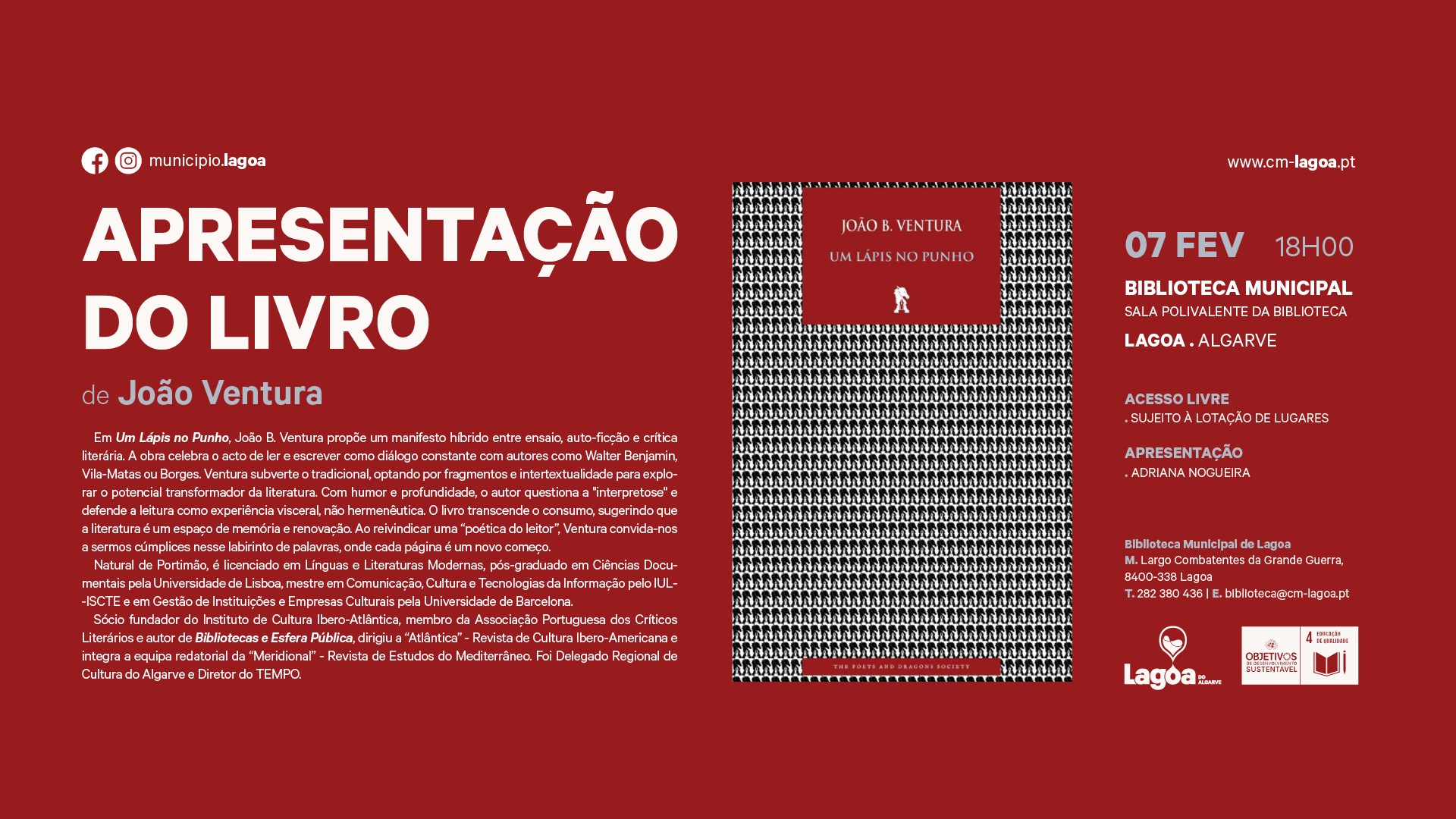 No dia 07 de fevereiro, pelas 18h00, a Biblioteca Municipal de Lagoa recebe a Apresentação Pública do Livro 📚Um Lápis no Punho✏️, de João B. Ventura. A apresentação estará a cargo de Adriana Nogueira e a entrada é gratuita!