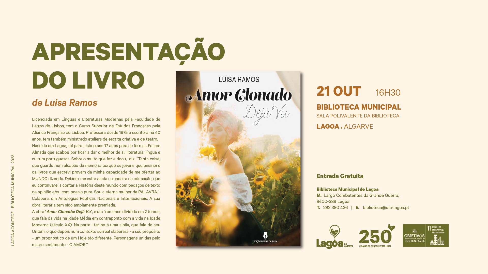 A Biblioteca Municipal de Lagoa recebe no dia 21 de outubro, na Sala Polivalente, pelas 16h30, a Apresentação Pública do Livro “Amor Clonado: Déjà Vu” de Luísa Ramos.