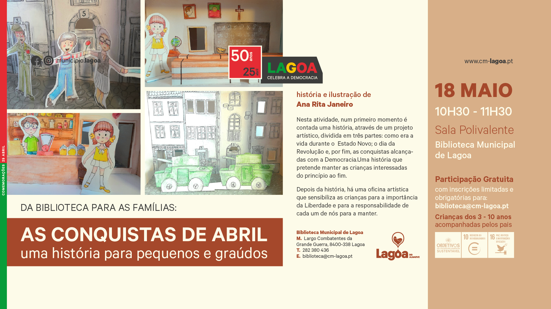 O mês de maio traz, até à Biblioteca Municipal de Lagoa, a atividade 📖“Da Biblioteca para as Famílias”📚 e, no dia 18 de maio, pelas 10h30, irá receber a história e oficina 🎉“As Conquistas de Abril: Uma história para pequenos e graúdos”🌈, por Ana Rita Janeiro.