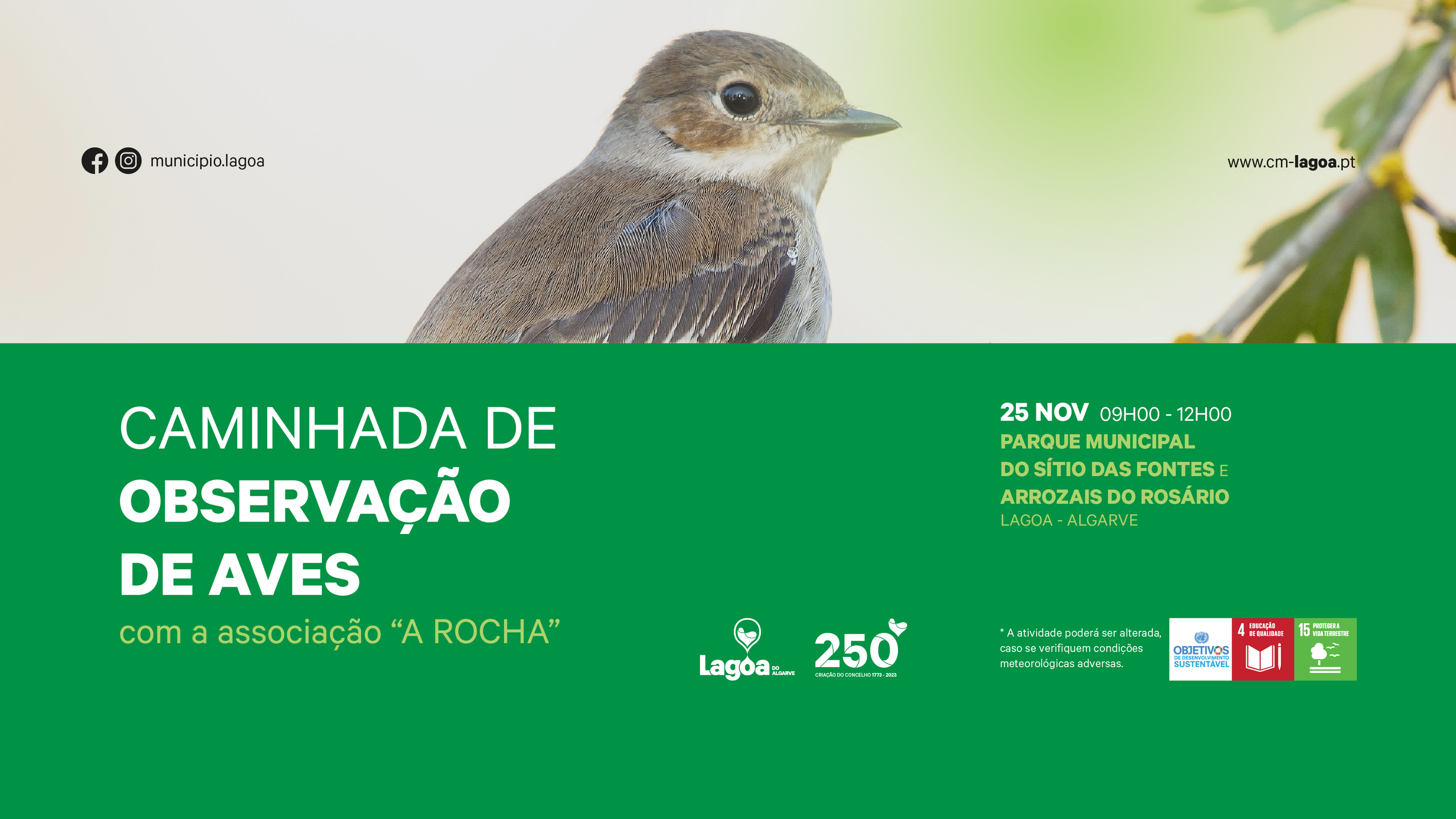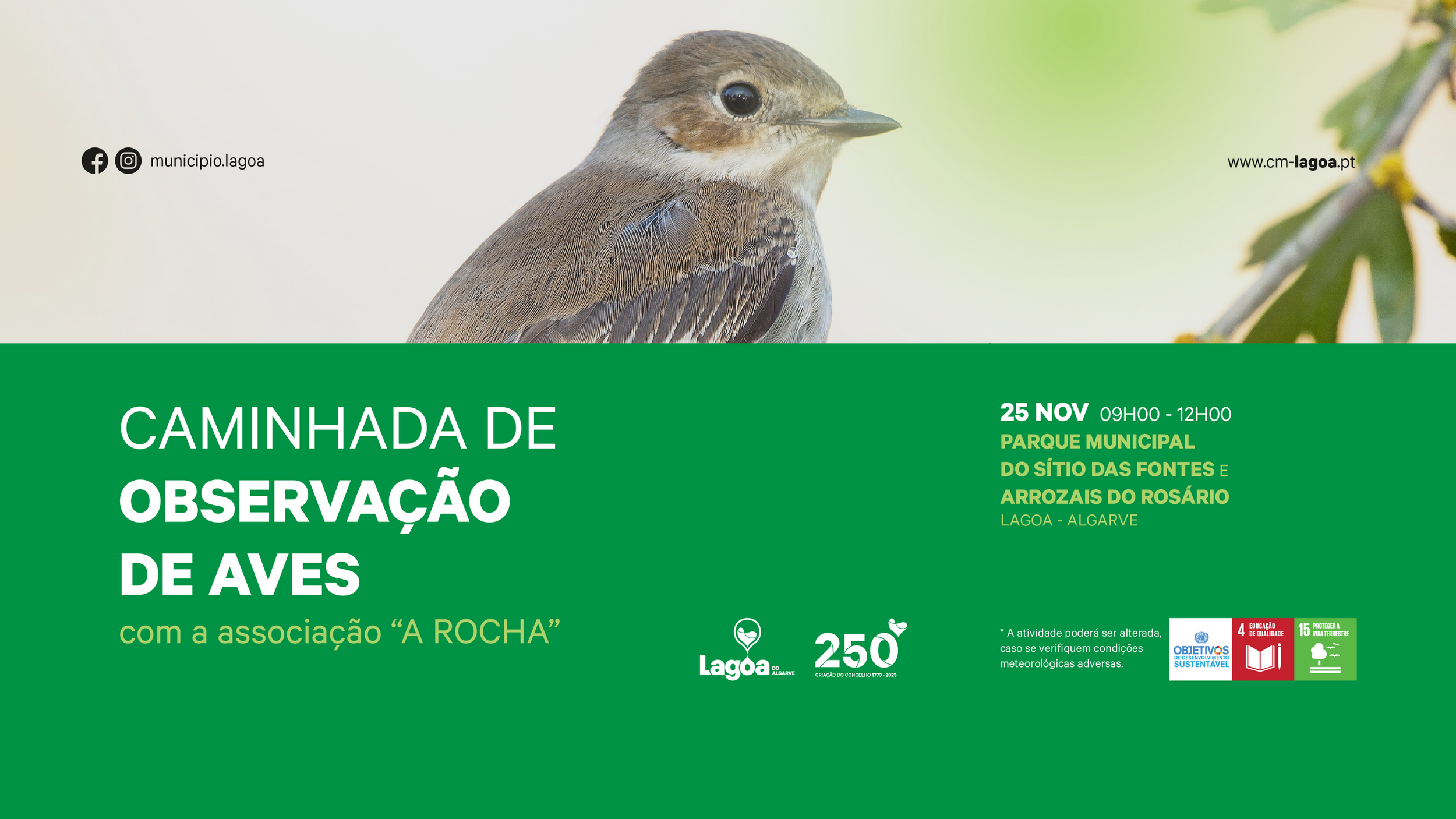 O Município de Lagoa irá promover no dia 25 de novembro, sábado, às 09h00, mais uma “Caminhada de Observação de Aves”, em parceria com a Associação "A Rocha". O guia será Guillaume Rethore daquela associação.