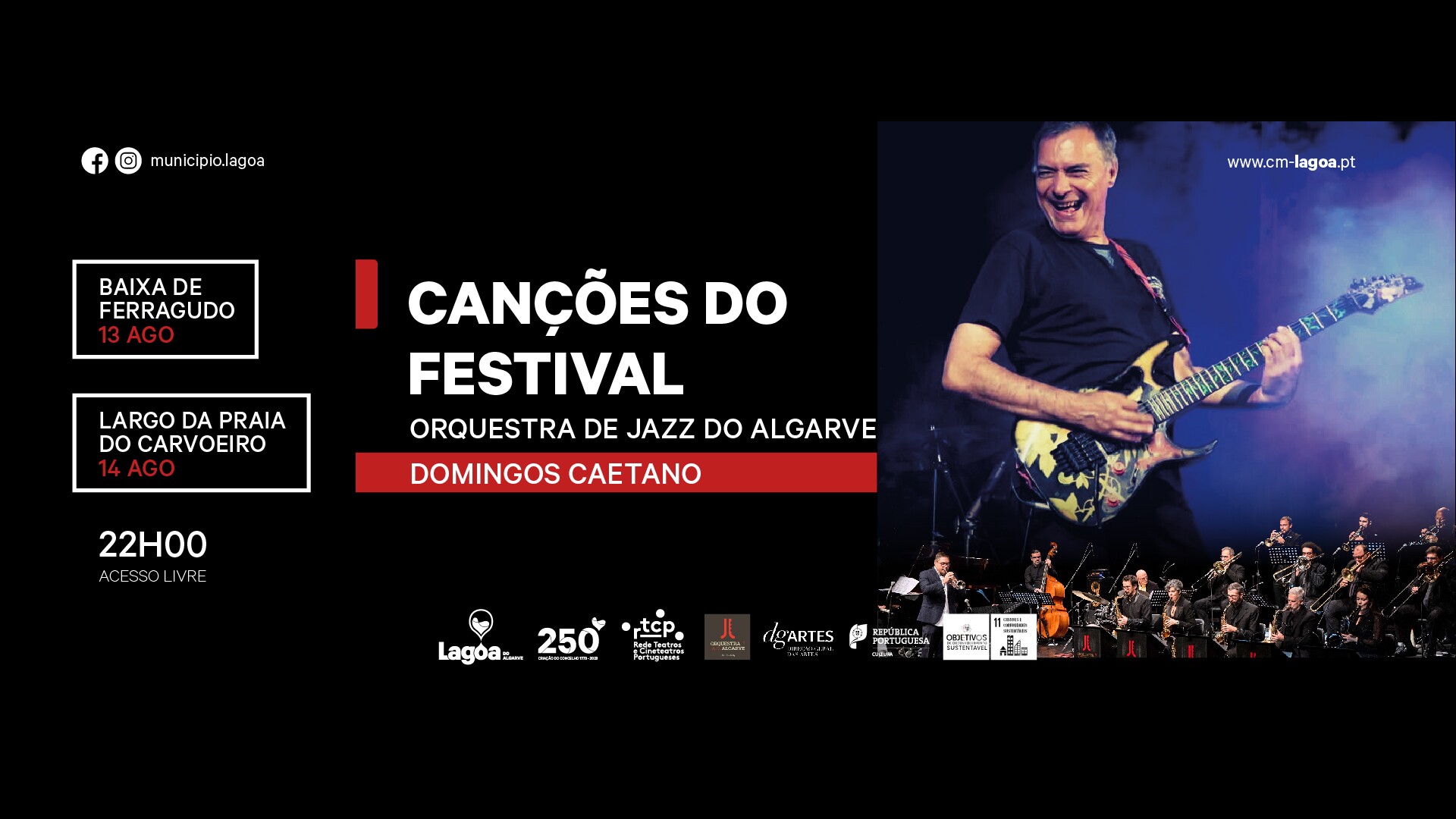 A Orquestra de Jazz do Algarve volta a animar as noites de verão no Concelho de Lagoa e, este ano, em dose dupla! Em parceria com Domingos Caetano, líder da famosa banda algarvia Iris, a OJA irá apresentar em palco o espetáculo “Canções do Festival”, com apresentações no dia 13 de agosto na Baixa de Ferragudo e no dia 14 de agosto no Largo da Praia do Carvoeiro.