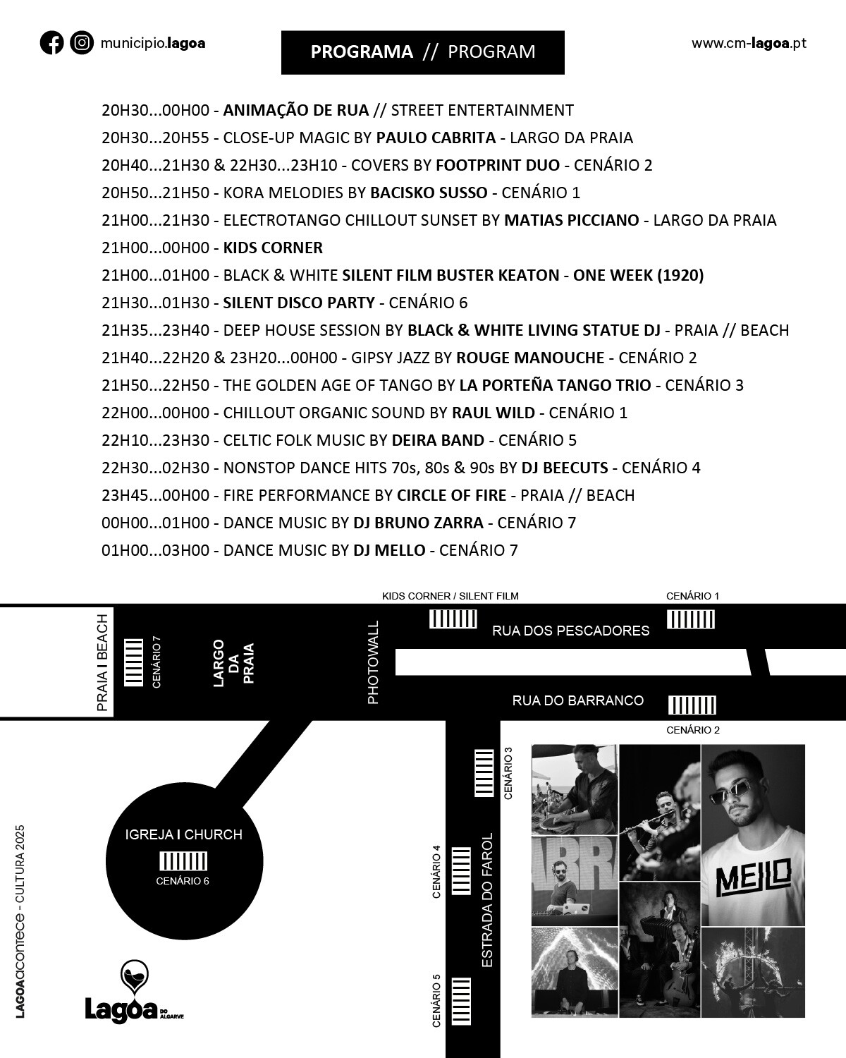 O preto e o branco são o dress code obrigatório, refletindo-se também nas múltiplas expressões artísticas que animarão a noite – da música à dança, passando pela magia, o cinema e a animação de rua.