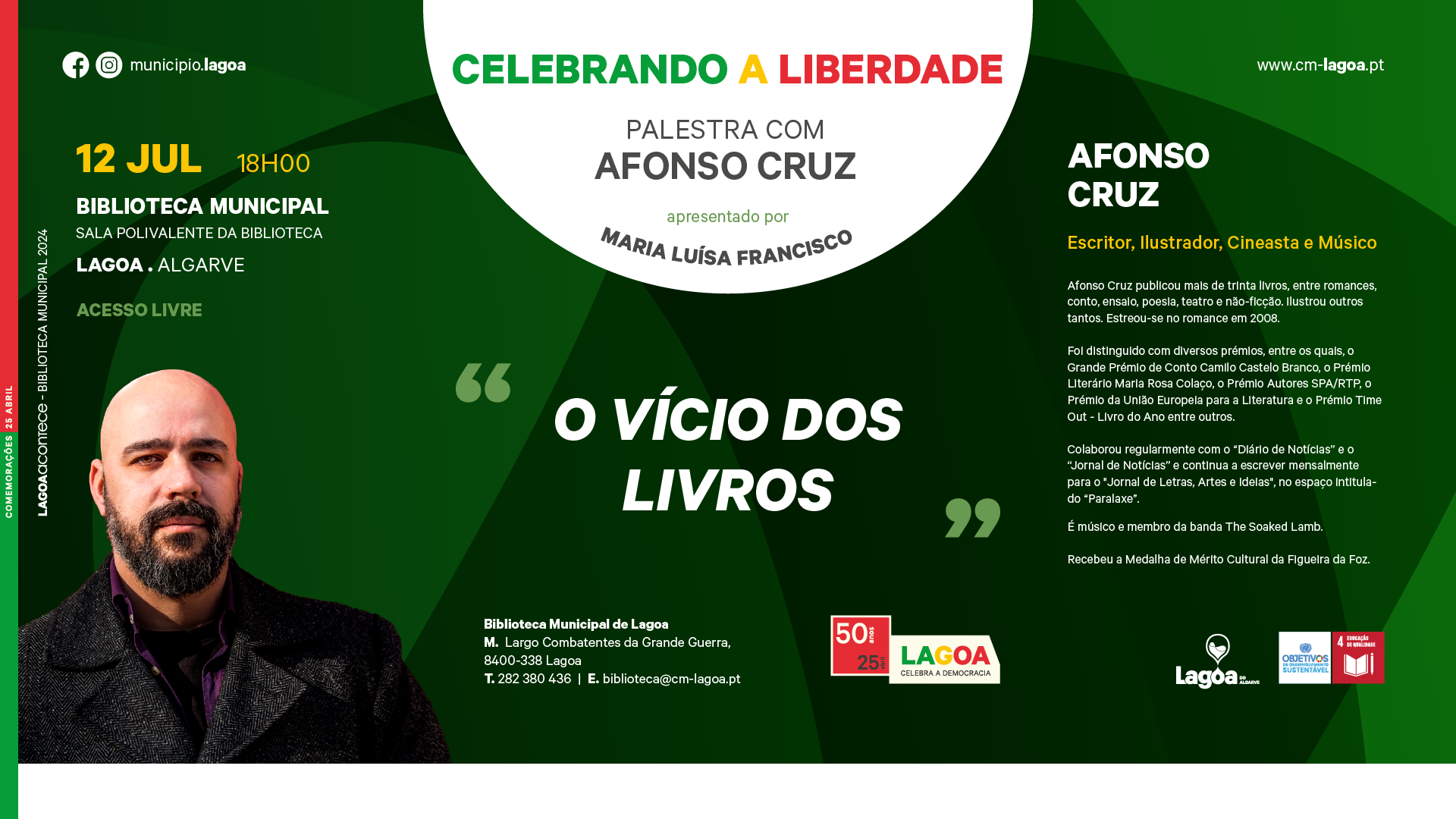 Celebrando a Liberdade: Palestra Literária com o escritor Afonso Cruz - “O vício dos livros”.