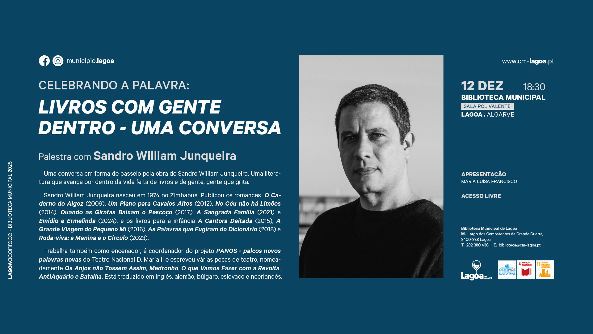 Sandro William Junqueira, nascido em 1974 no Zimbabué, é autor de uma vasta obra que atravessa o romance, a literatura infantojuvenil e o teatro. Entre os seus romances destacam-se O Caderno do Algoz, Um Piano para Cavalos Altos, No Céu não há Limões, Quando as Girafas Baixam o Pescoço, A Sangrada Família e Emídio e Ermelinda.