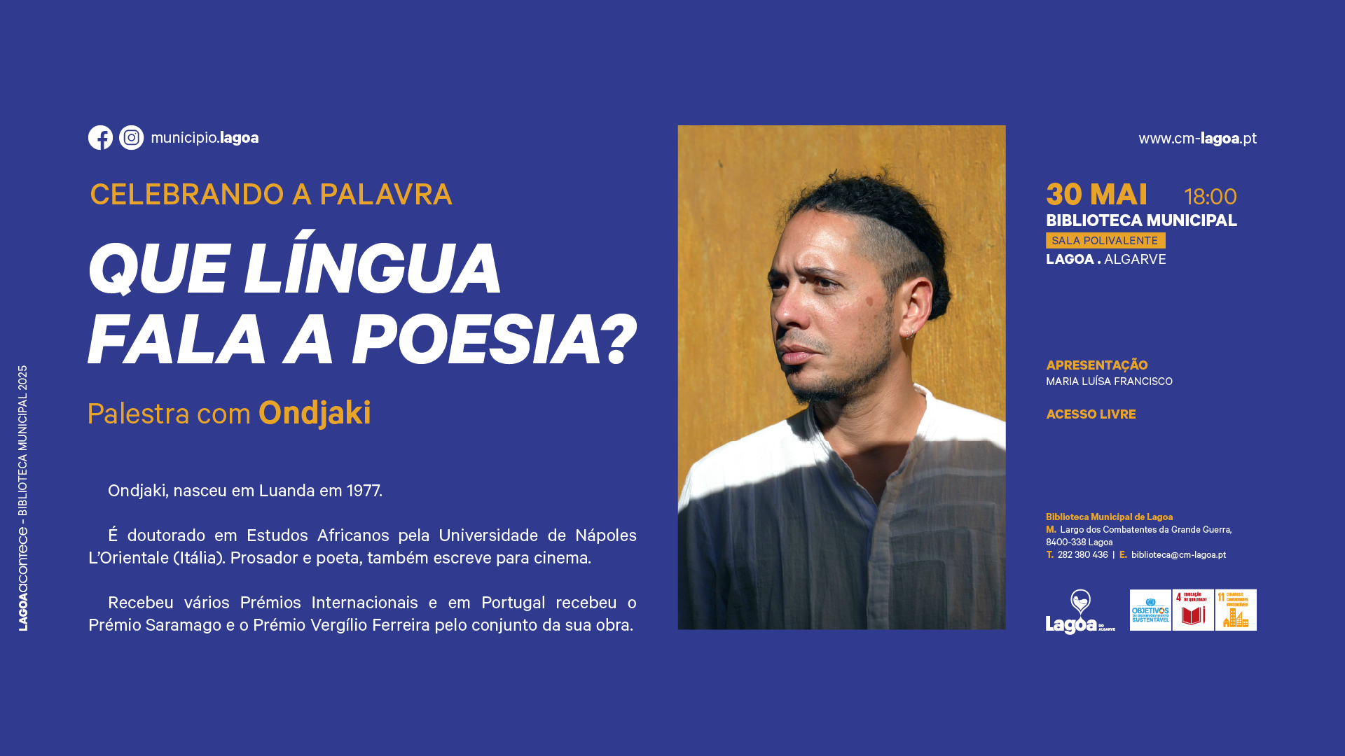 A Biblioteca Municipal de Lagoa dá inicio à atividade 🎉Celebrando a Palavra🗣️, um ciclo de palestras a decorrer ao longo de 2025. A primeira palestra será no dia 30 de maio, pelas 18h00, com o tema Que língua fala a poesia? com o escritor Ondjaki.