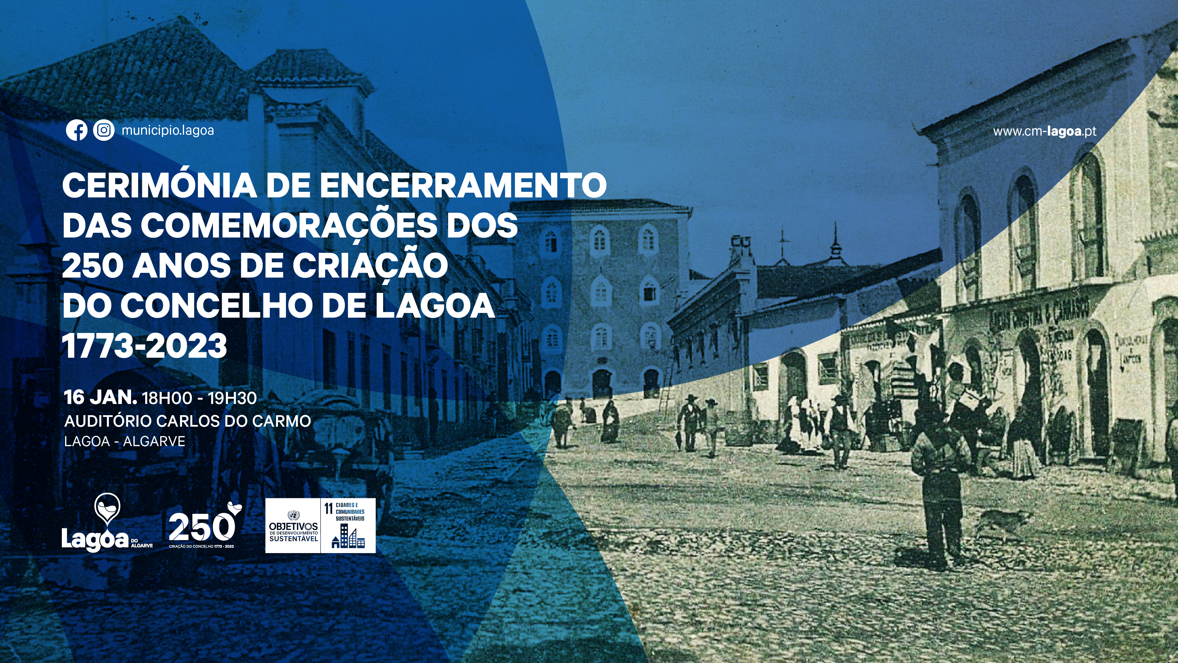 Para encerrar as comemorações dos 250 anos da fundação do concelho (16.01.1773), este Município irá realizar uma cerimónia no dia 16 de janeiro de 2024, pelas 18h00, no Auditório Carlos do Carmo, assinalando um dia histórico que nos traz à memória, todos e todas aquelas que fizeram de Lagoa um município independente, com identidade própria e reconhecimento nacional. Um caminho que foi traçado com grande perseverança e resiliência de todas as pessoas ao longo destes 250 anos.