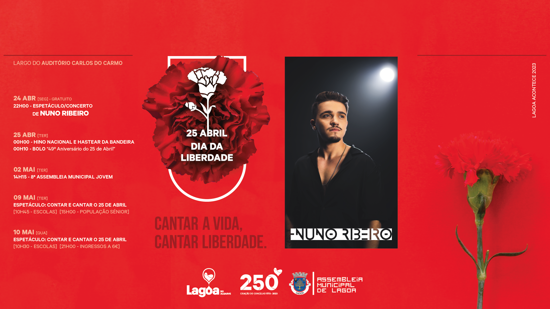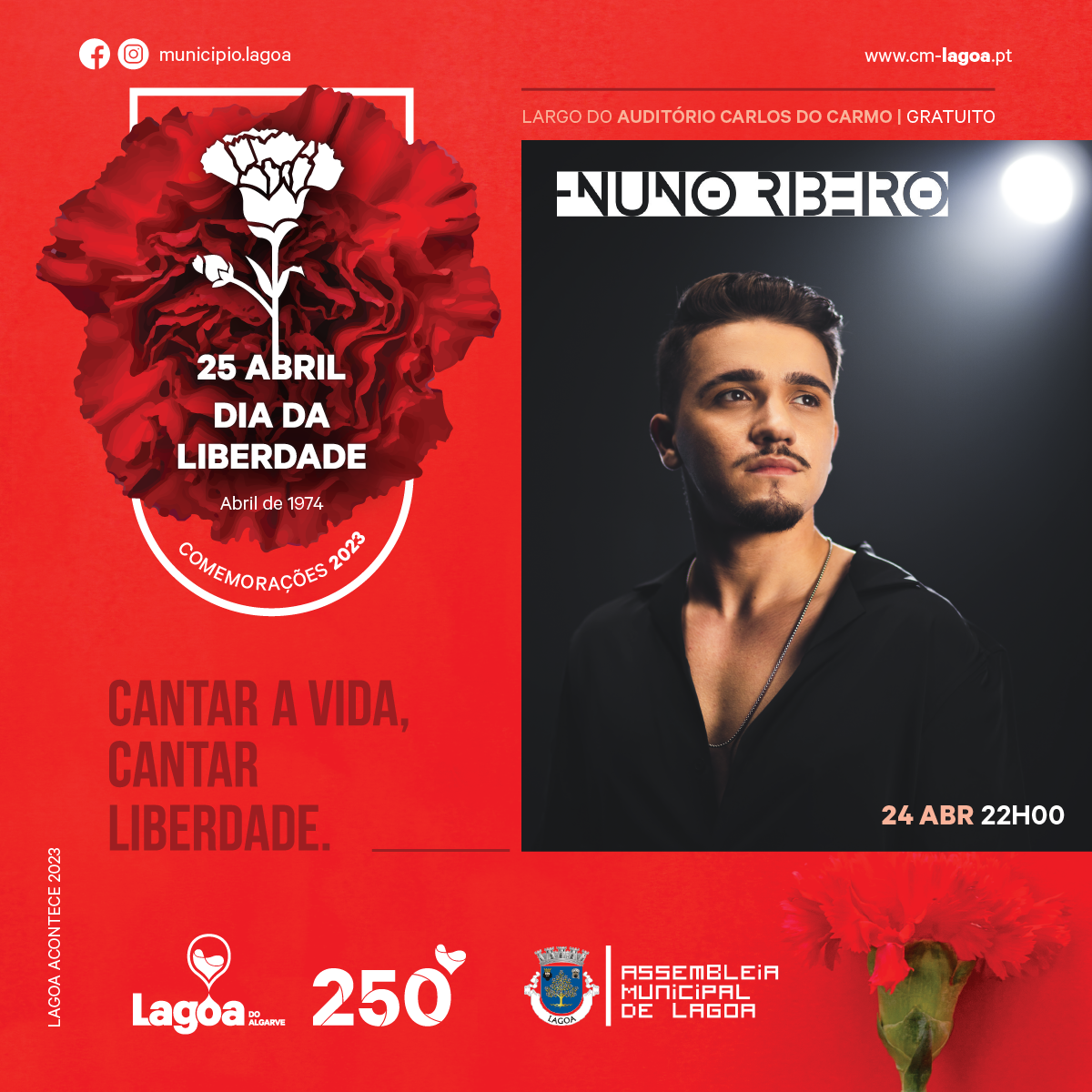 No dia 24 de abril, pelas 22h00 realiza-se o concerto de “Nuno Ribeiro”, no Largo do Auditório Carlos do Carmo, que promete uma noite ao som das músicas do cantor onde não irão faltar os maiores êxitos.