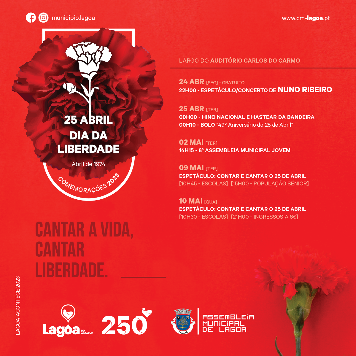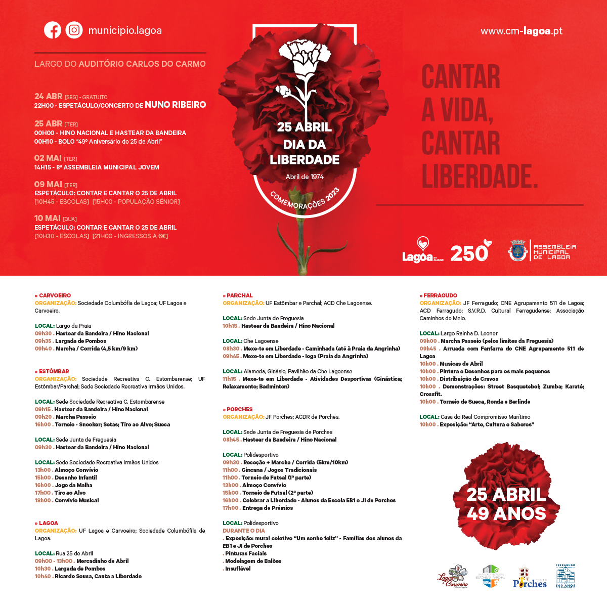 Dia 25 de Abril assinala o 49º aniversário da Revolução dos Cravos e o Município de Lagoa irá celebrar este dia com um conjunto de atividades que se prolongam até dia 02 de maio.