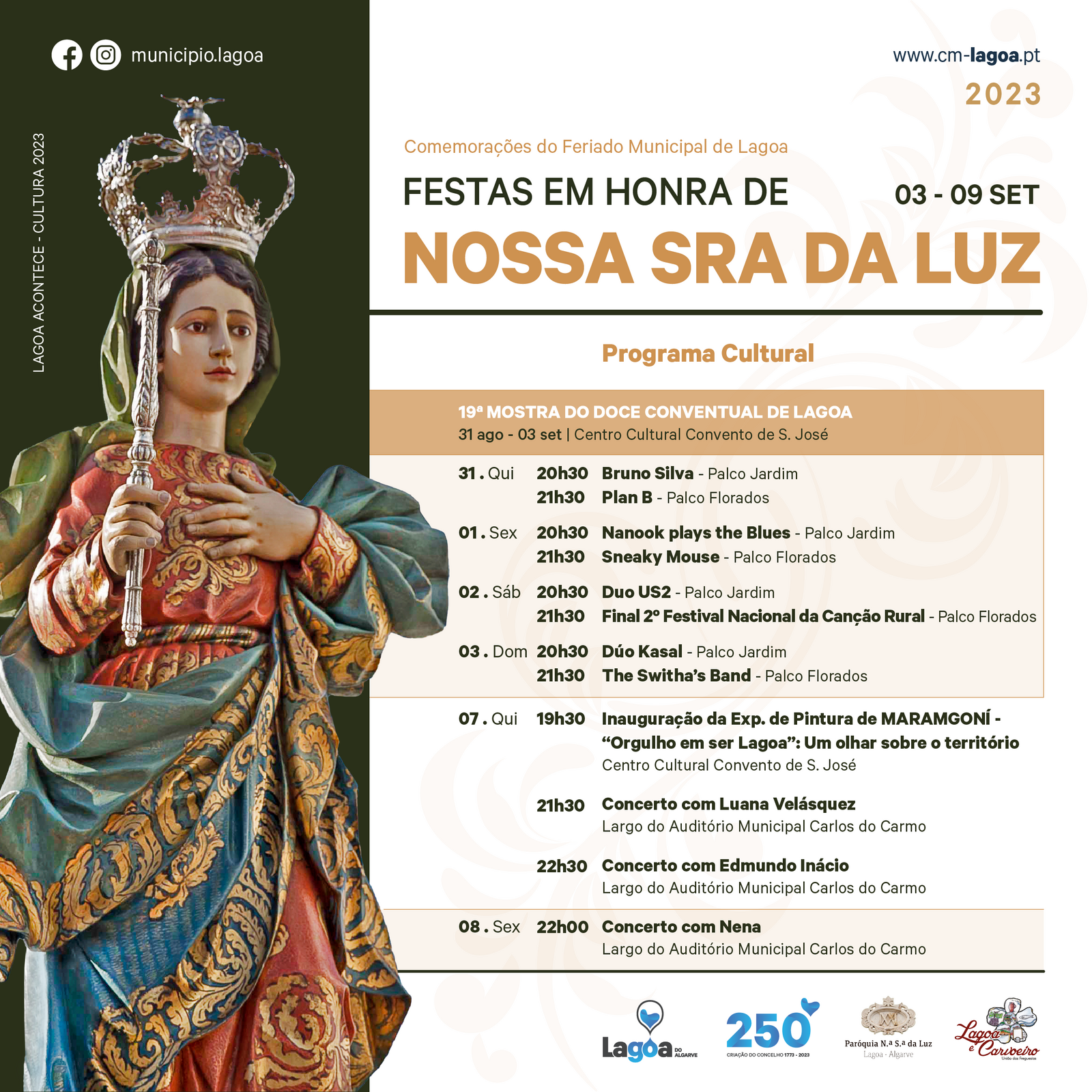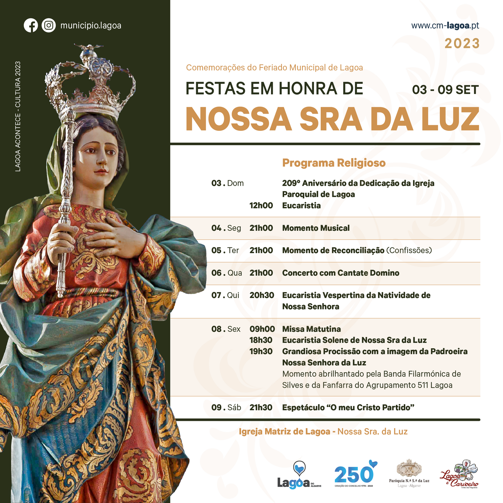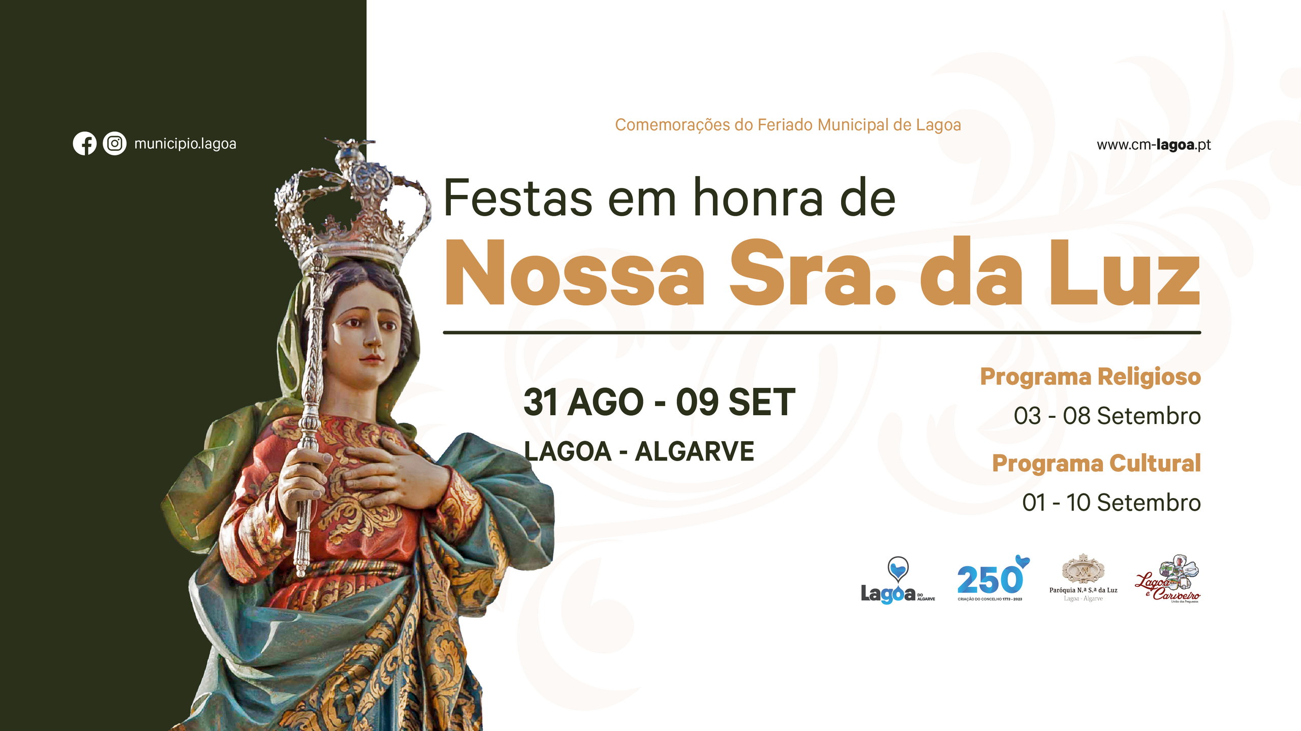 A Câmara Municipal de Lagoa em parceira com outras entidades do concelho, vai promover um programa com diversas atividades de caráter religioso e cultural, onde se inserem as festas da padroeira Nossa Senhora da Luz e o Feriado Municipal no dia 08 de setembro com grandiosos espetáculos que vão animar os Lagoenses e a todos os que visitam Lagoa nestes dias.