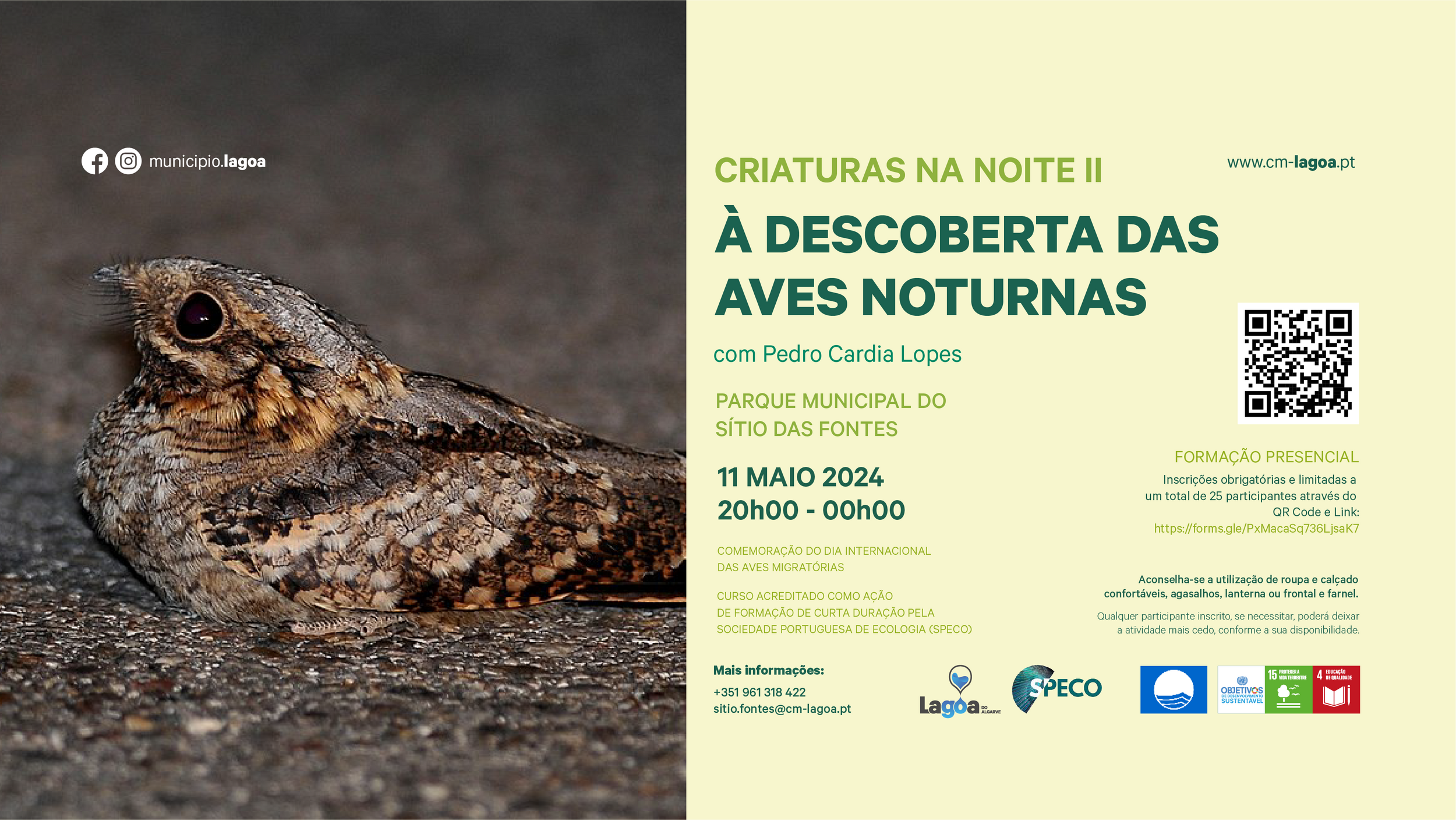 Sinopse: No dia 11 de Maio (Sábado), das 20h00 às 24h00, no âmbito da Comemoração do Dia Mundial das Aves Migratórias, o Município de Lagoa (Algarve) irá promover a Oficina 🦉"Criaturas na Noite 2 - À Descoberta das Aves Noturnas"🌜, com o ornitólogo Pedro Cardia Lopes, no Parque Municipal do Sítio das Fontes – Centro de Interpretação da Natureza.
