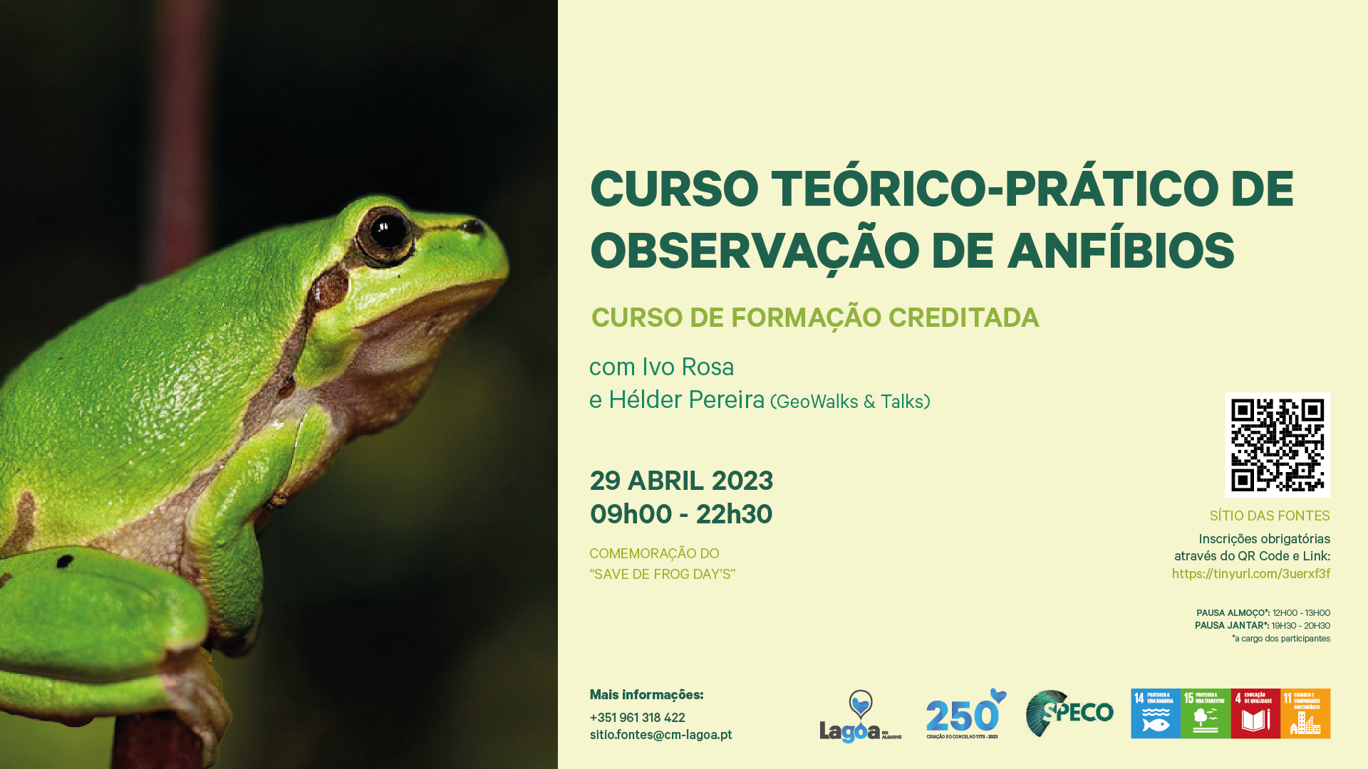 Com vista a realizar no decorrer do SAVE THE FROG DAY'23, um dia especial para a conservação de anfíbios a nível mundial, o presente curso pretende dar a conhecer os mais ameaçados e mal-amados vertebrados aquáticos de Portugal. Esta formação terá lugar no dia 29 de abril, no Parque Municipal do Sítio das Fontes, entre as 09h00 e as 22h30 com pausa para o almoço e jantar, sendo as refeições da responsabilidade dos participantes.