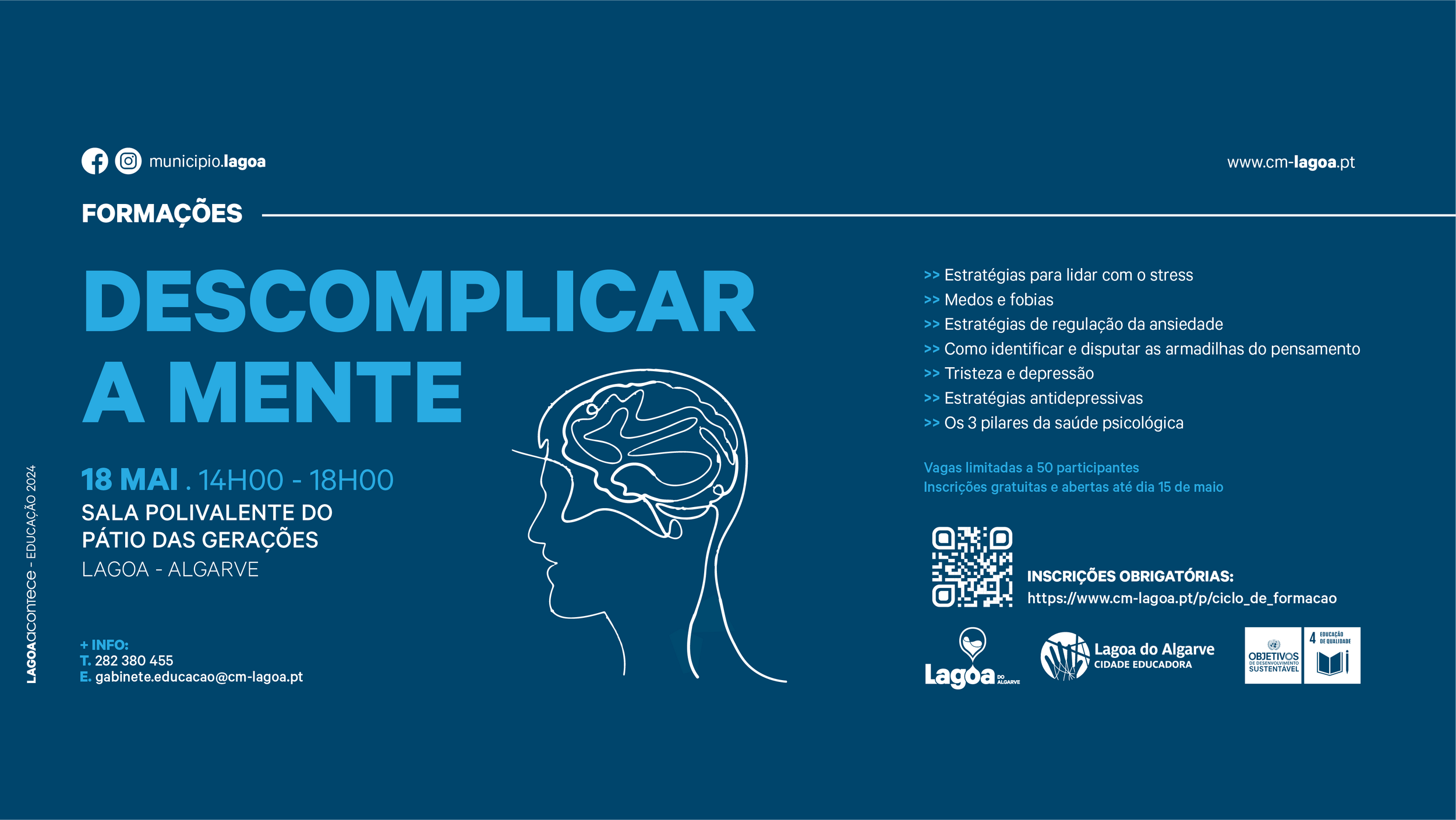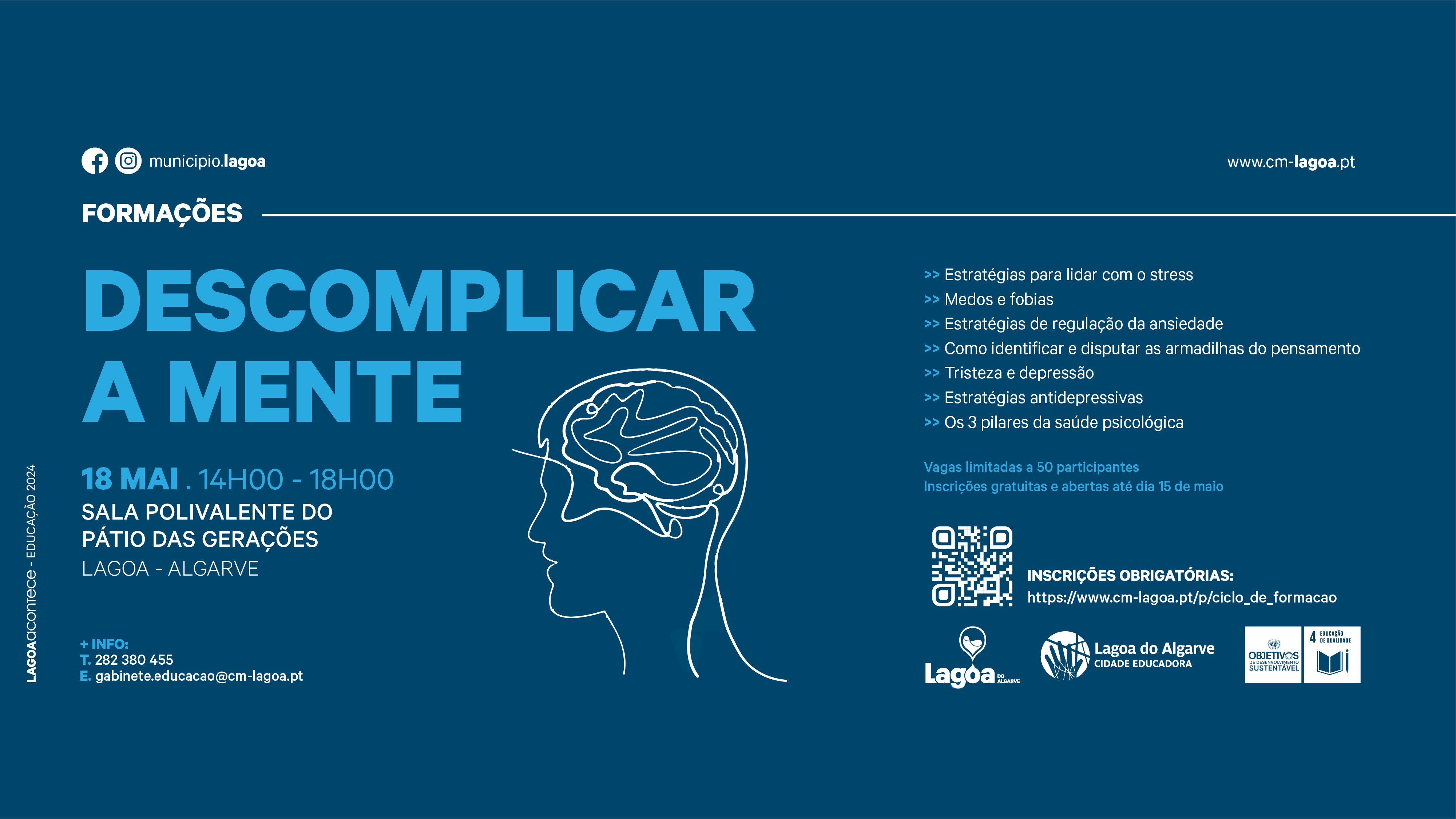 O Município de Lagoa vai dinamizar a Ação de Formação "Descomplicar a Mente"🧠 no dia 18 de maio, pelas 14h00, no Pátio das Gerações, em Lagoa.
