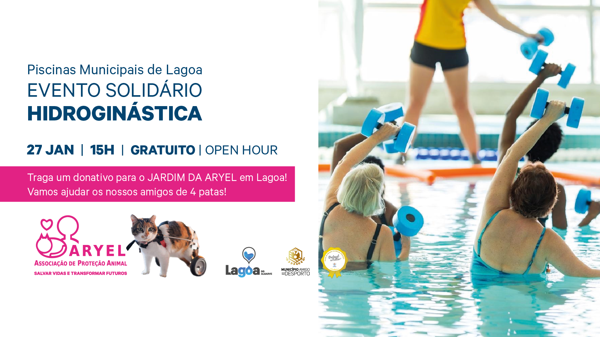 No dia 27 de janeiro de 2023 irá realizar-se, nas Piscinas Municipais de Lagoa, um evento solidário de hidroginástica, com o intuito de promover a recolha de alimentos e outros bens de primeira necessidade para animais a serem doados à Associação de Proteção ao Animal - Jardim da Aryel.
