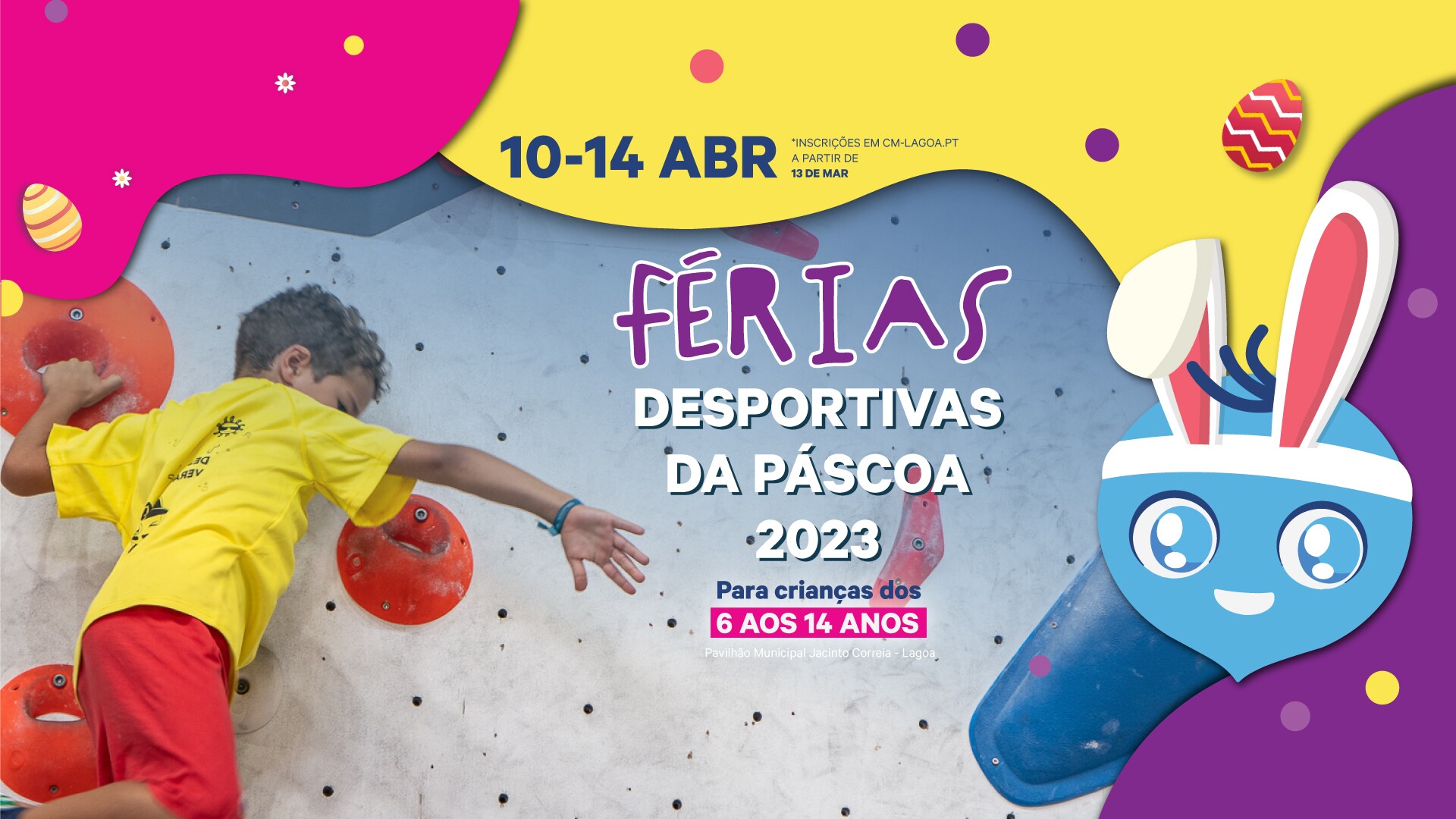 As Férias Desportivas da Páscoa 2023 terão a duração de uma semana e vão realizar-se de 10 a 14 de abril, sendo destinadas a crianças nascidas entre os anos 2009 e 2017 (dos 6 aos 14 anos).