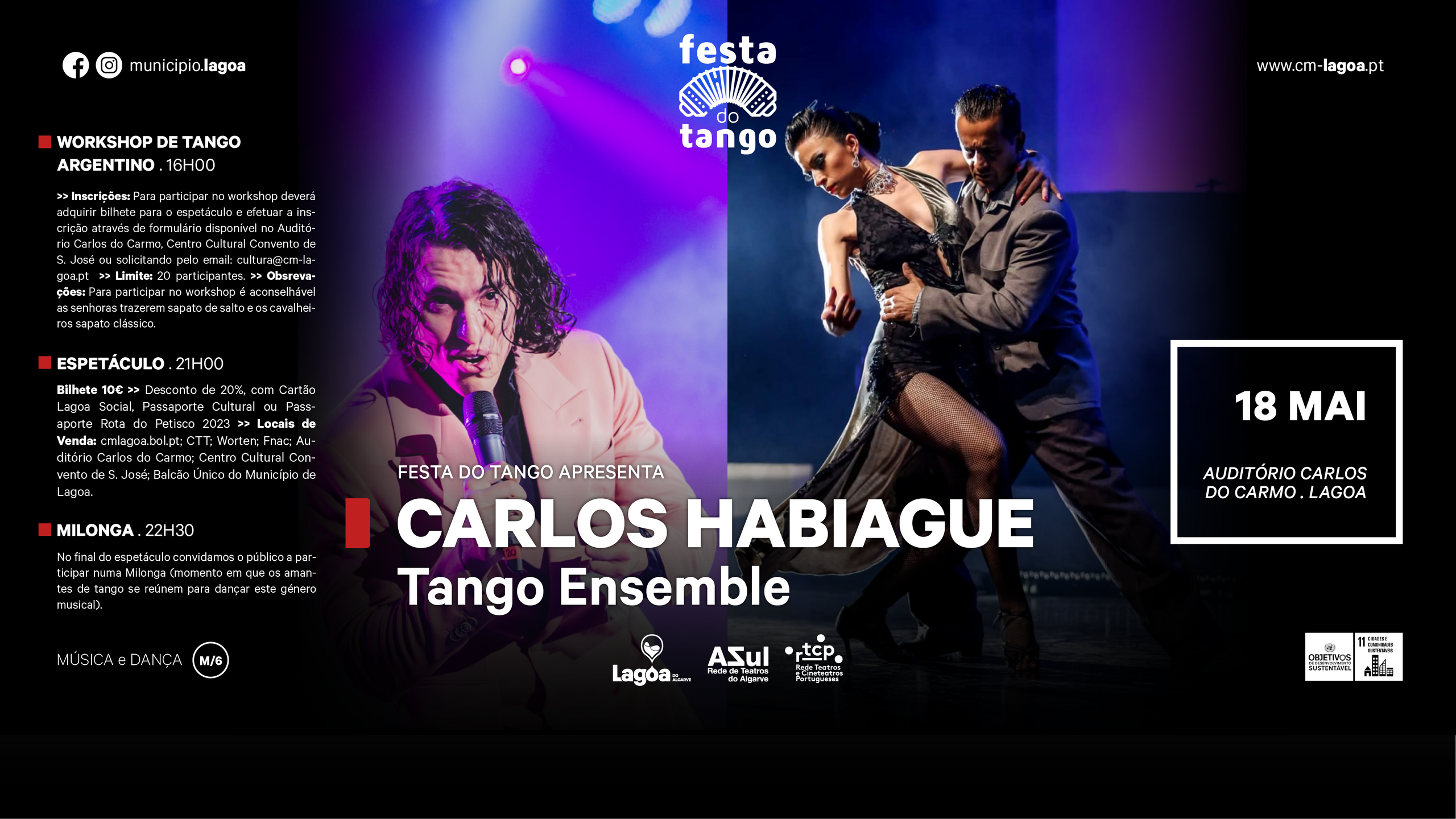 A 🎶“Festa do Tango”🌟 está de regresso a Lagoa, para mais uma edição com um dia dedicado ao tango. Este ano, o Auditório Carlos do Carmo irá receber no seu palco 🕺“Carlos Habiague Tango Ensemble”🎶, no dia 18 de maio, pelas 21h00. No mesmo dia, pelas 16h00, será realizado um 🕺Workshop de Tango Argentino💃 que é de participação gratuita mediante a aquisição do bilhete para o Espetáculo “Carlos Habiague Tango Ensemble“, e limitado a 20 participantes.