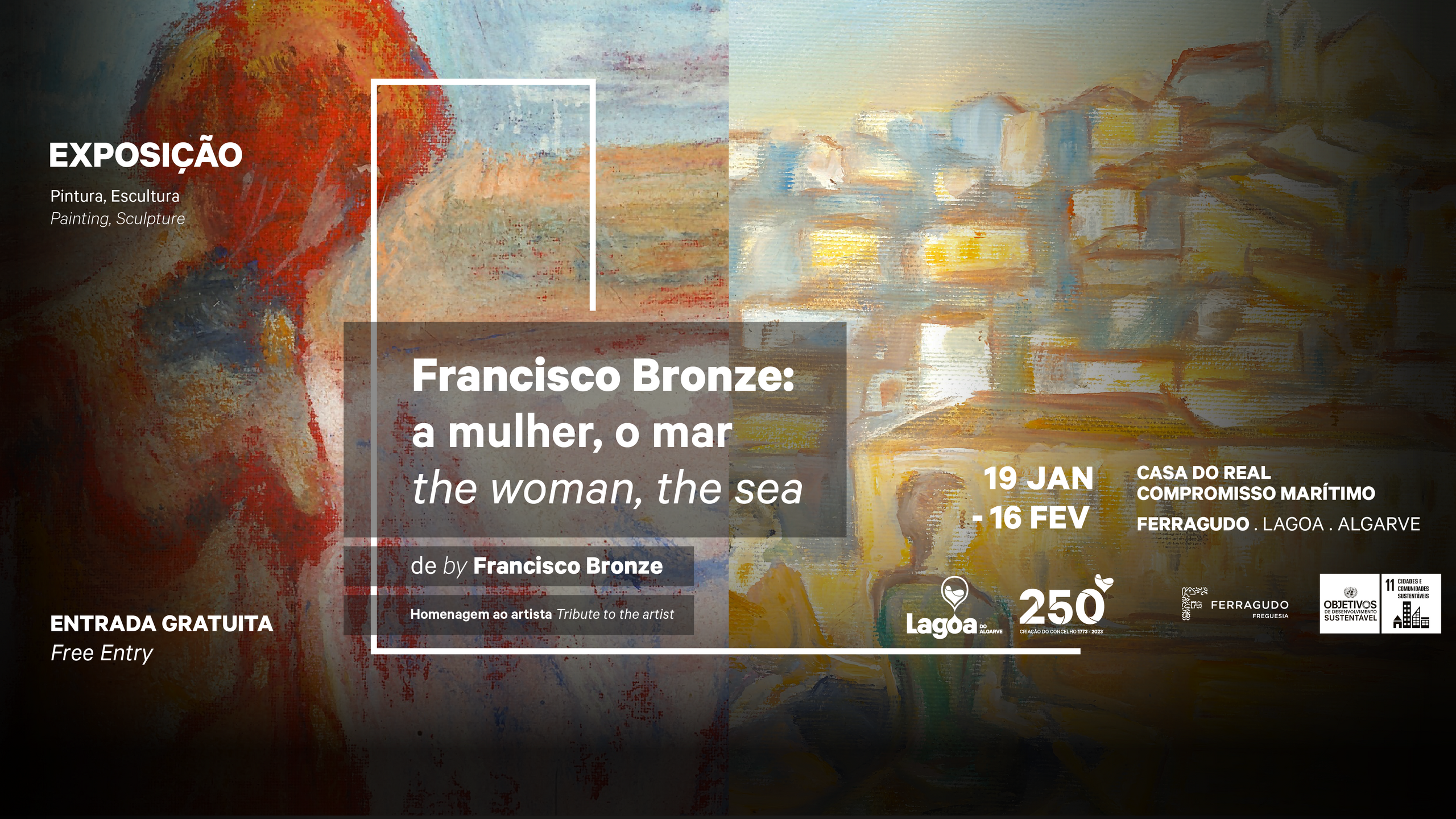 "Francisco Bronze: a mulher, o mar | the woman, the sea" é uma exposição de homenagem ao pintor ferragudense promovida pelo Município de Lagoa com o apoio da Junta de Freguesia de Ferragudo. Trata-se de uma oportunidade de conhecer ou de revisitar o legado do artista, uma mostra dupla que exibirá oito dezenas de trabalhos, muitos dos quais concebidos nos últimos anos, e que têm como fios temáticos condutores elementos femininos e marítimos, em grande medida inspirados nas memórias de infância e nas paisagens da terra natal.