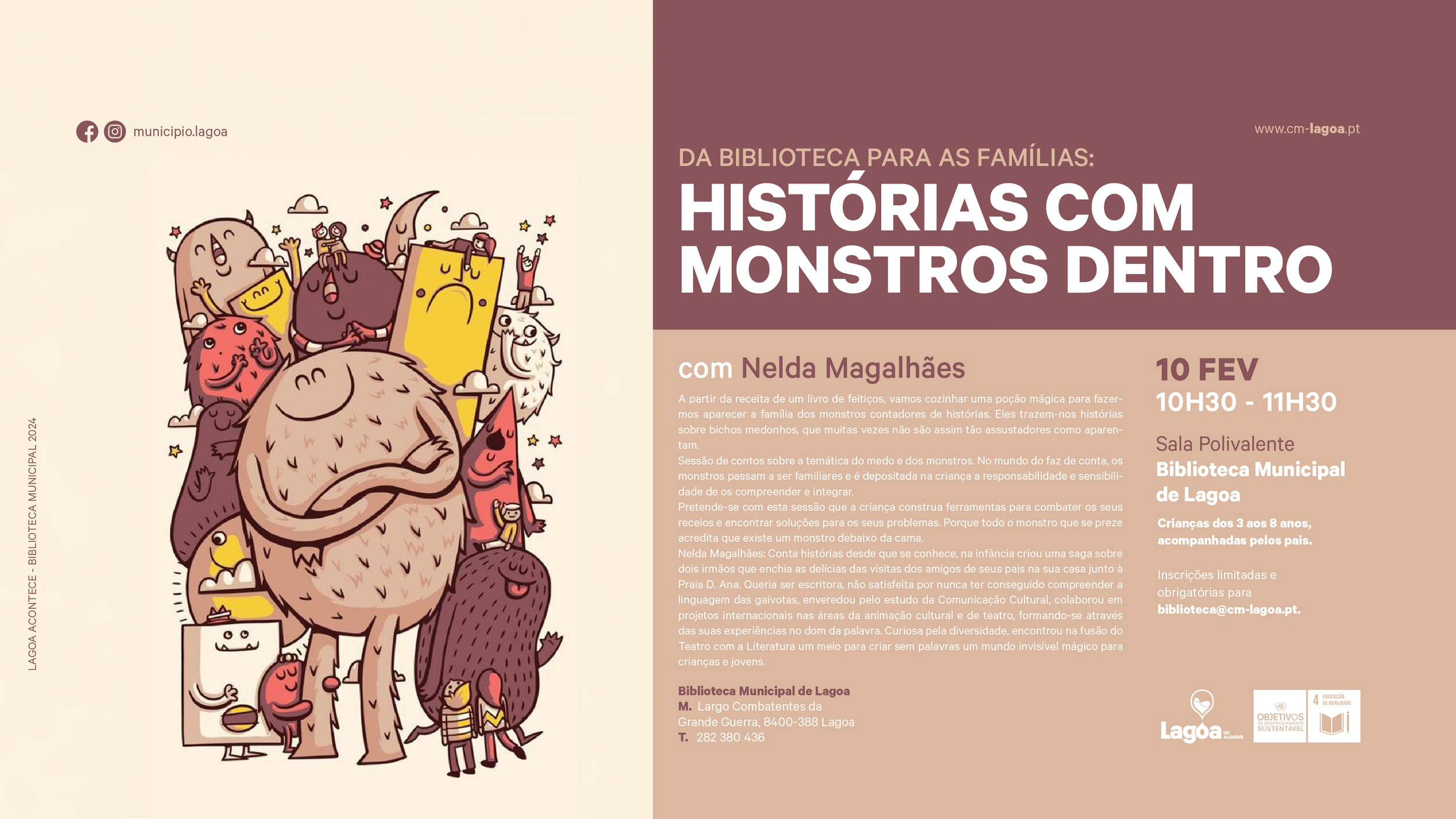 O mês de fevereiro traz, até à Biblioteca Municipal de Lagoa, a atividade “𝗗𝗮 𝗕𝗶𝗯𝗹𝗶𝗼𝘁𝗲𝗰𝗮 𝗽𝗮𝗿𝗮 𝗮𝘀 𝗙𝗮𝗺𝗶́𝗹𝗶𝗮𝘀” e, no dia 10 de fevereiro, pelas 10h30, irá receber o conto “𝗛𝗶𝘀𝘁𝗼́𝗿𝗶𝗮𝘀 𝗰𝗼𝗺 𝗠𝗼𝗻𝘀𝘁𝗿𝗼𝘀 𝗗𝗲𝗻𝘁𝗿𝗼”, por Nelda Magalhães.