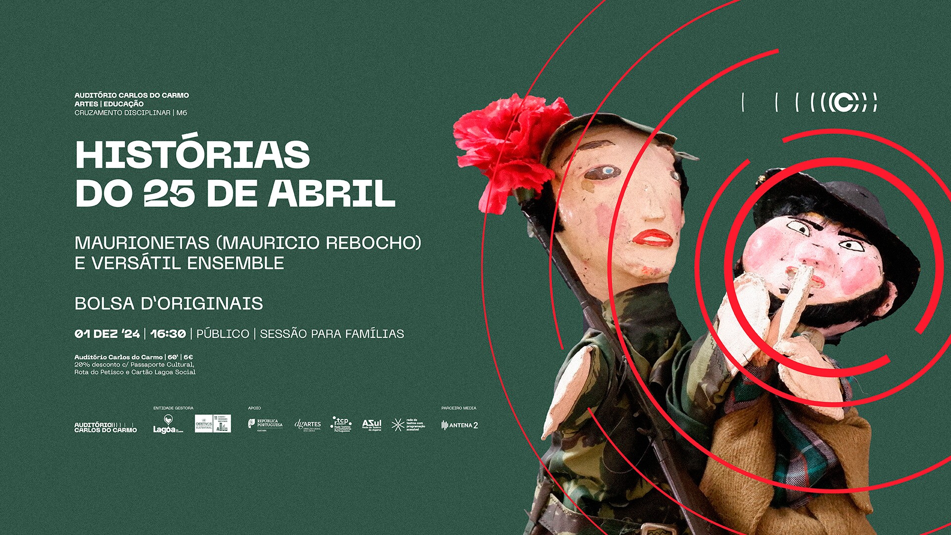 Sinopse: 🎭Histórias do 25 de Abril🌹 é um espetáculo multidisciplinar que junta uma criação original de teatro de marionetas, de Maurício Rebocho, com o Versátil Ensemble e o grupo de bombos tradicionais Tomba-Lobos, num diálogo artístico que junta várias gerações em palco, como forma de celebrar os 50 anos de democracia e liberdade que a revolução de 1974 trouxe à sociedade portuguesa.