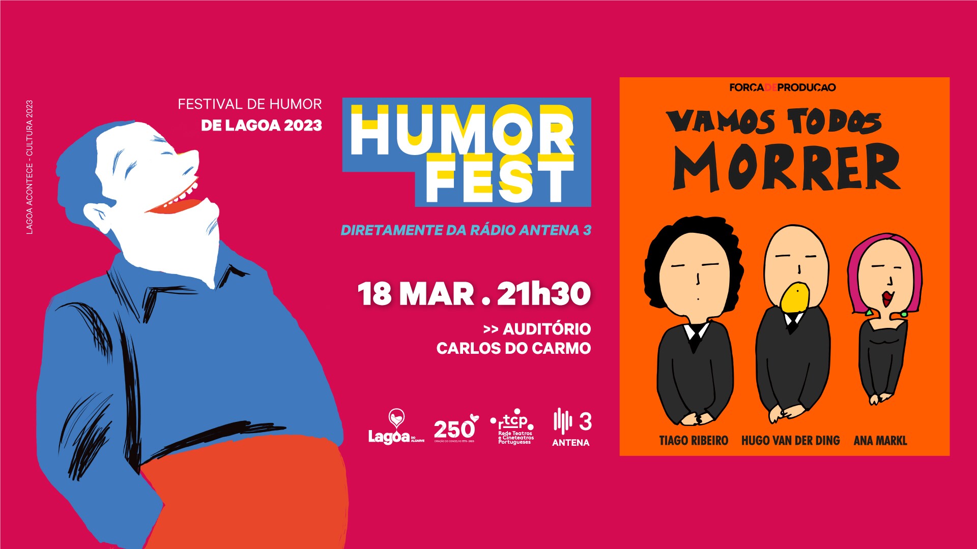 Hugo van der Ding, Ana Markl e Tiago Ribeiro saltam do estúdio da Antena 3 e aterram diretamente no Festival de Humor de Lagoa, HUMORFEST’2023, com o espetáculo “Vamos Todos Morrer”, no dia 18 de março, pelas 21h30, no Auditório Carlos do Carmo, em Lagoa.