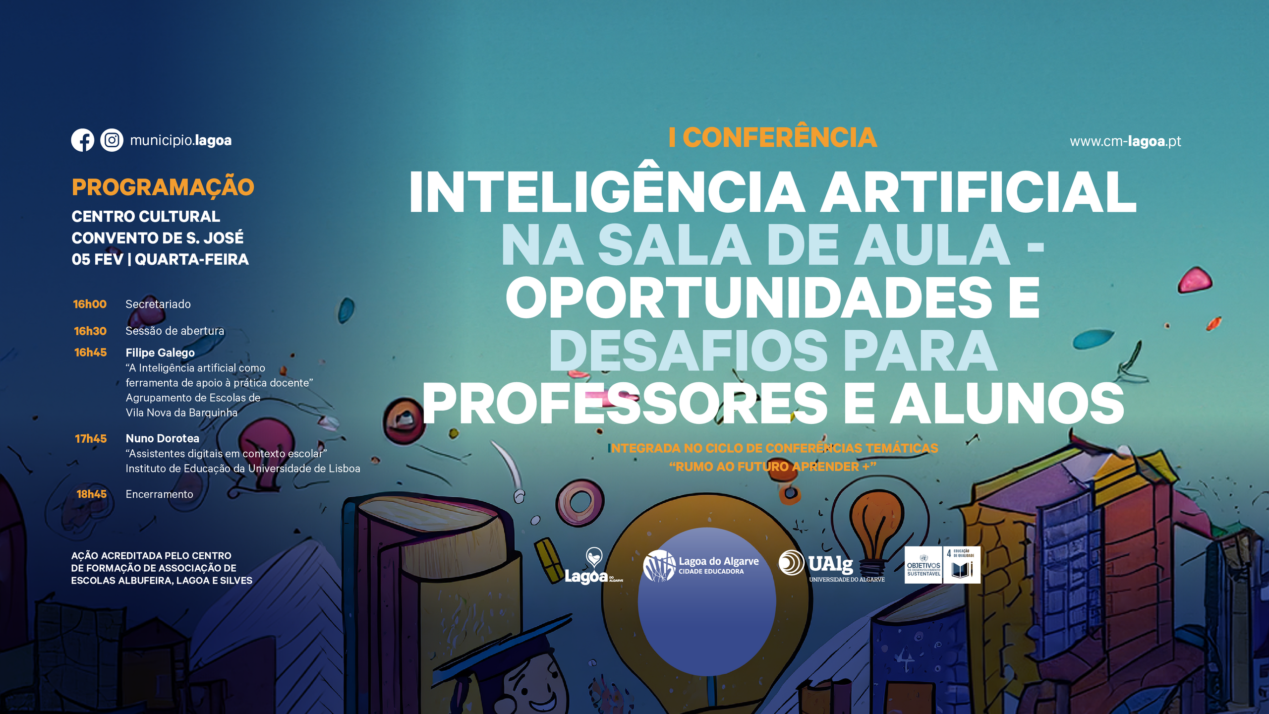 No dia 05 de fevereiro, pelas 16h00, o Centro Cultural Convento de S. José, em Lagoa, recebe o Ciclo de Conferências Temáticas “Rumo ao Futuro Aprender +”, com a realização da 1ª Conferência, deste ano letivo, sob o tema 🖥️Inteligência Artificial na Sala de Aula – Oportunidades e desafios para professores e alunos📝, destinada a Educadores, Professores, Técnicos de Educação, Técnicos de Saúde e Encarregados de Educação.