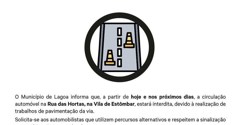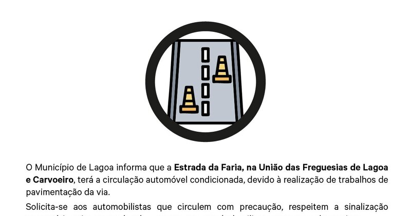O Município de Lagoa informa que a Estrada da Faria, na União das Freguesias de Lagoa e Carvoeiro, terá a circulação automóvel ...Eventos | Página Inicial | Alertas