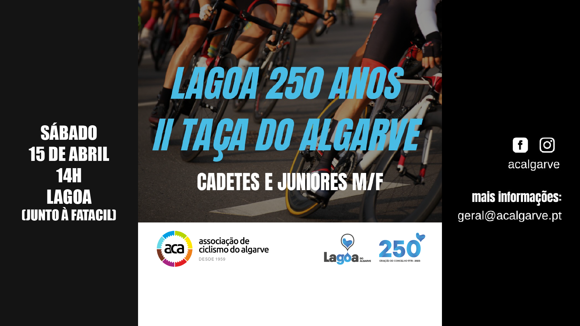 O Município de Lagoa recebe a prova de circuito de ciclismo de estrada, “Lagoa 250 Anos – II Taça do Algarve Cadetes e Juniores M/F”, integrada na Taça Regional do Algarve, no dia 15 de abril, pelas 14h, com partida e chegada junto ao Parque Municipal de Feiras e Exposições de Lagoa (FATACIL).