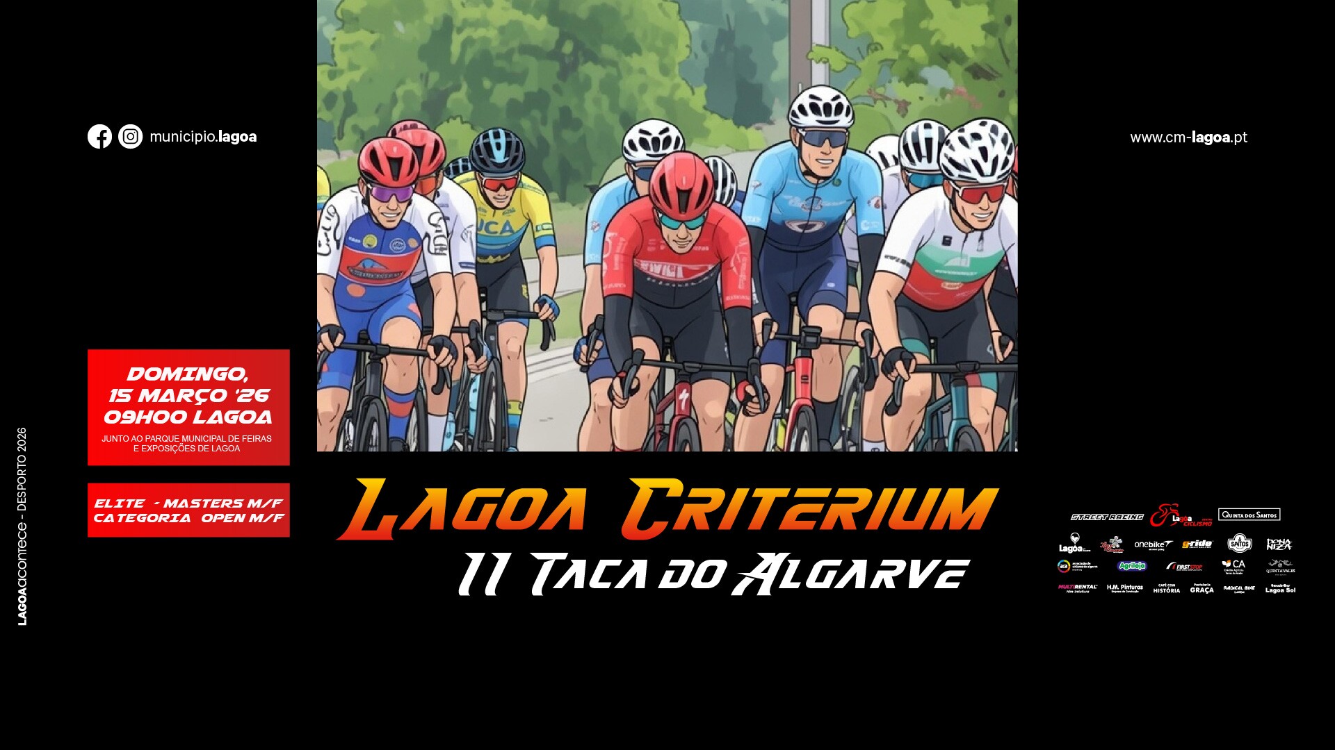No dia 15 de março, pelas 09h00, tem início a prova de ciclismo 🏆Lagoa Criterium🚴♂️ integrada na II Taça do Algarve, nos escalões de Elite, Masters e Open, nas vertentes Masculina e Feminina. A partida e chegada será junto ao Parque Municipal de Feiras e Exposições de Lagoa – Estrada Vale del Rei.