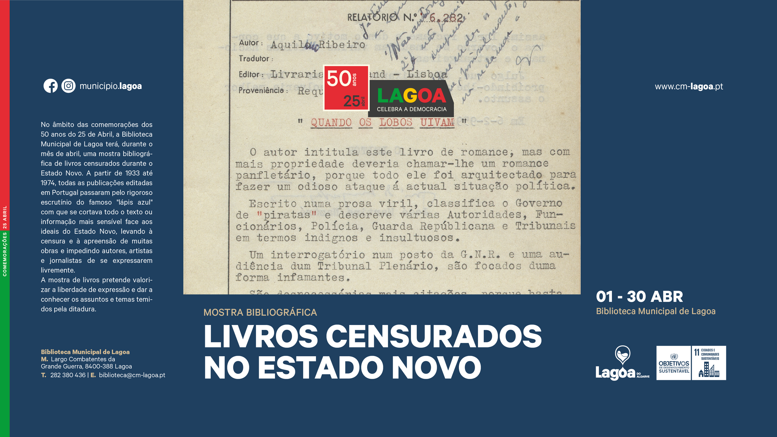 Sinopse: No âmbito das comemorações dos 50 anos do 25 de Abril, a Biblioteca Municipal de Lagoa terá, durante o mês de abril, uma mostra bibliográfica de livros censurados durante o Estado Novo.