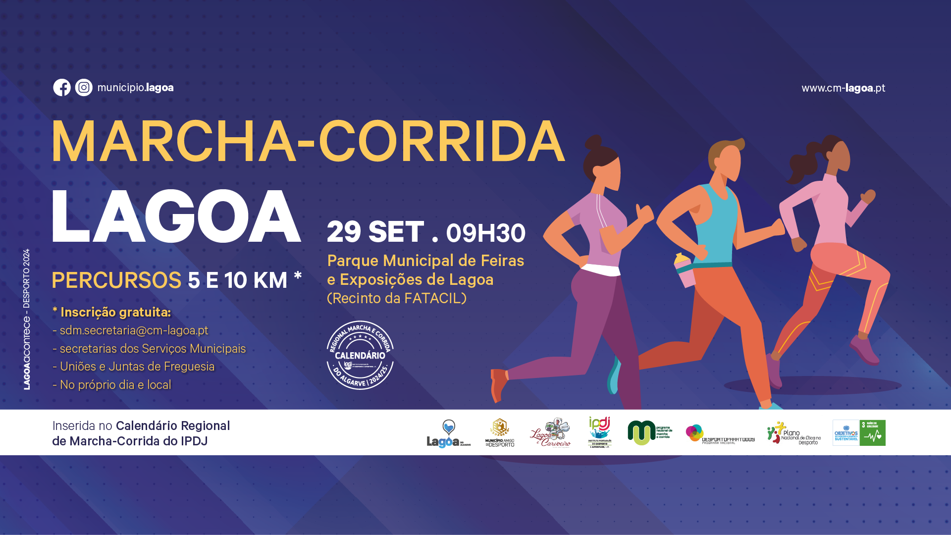 No próximo dia 29 de setembro, pelas 09h30, tem início a 🚶♂️“Marcha Corrida de Lagoa”🏃♀️, com partida do Parque Municipal de Feiras e Exposições de Lagoa (Recinto da FATACIL), numa parceria do Município de Lagoa e do IPDJ. As inscrições, no local, começam pelas 08h30. A participação é gratuita.