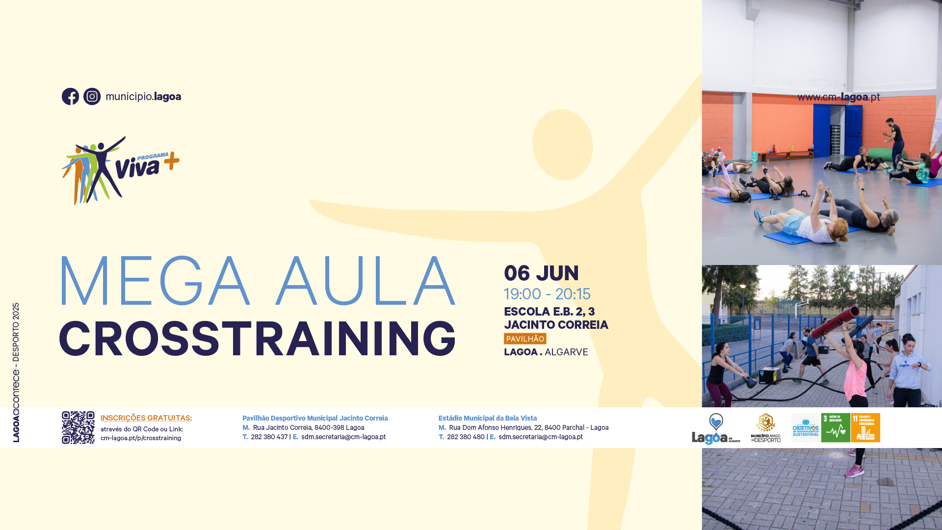 O Programa Viva+ volta a promover mais uma atividade no seu âmbito, com a realização da 💪Mega Aula de Crosstraining 2025💦 no próximo dia 06 de junho, entre as 19h00 e as 20h15, no pavilhão da Escola EB 2,3 Jacinto Correia, em Lagoa e a participação é gratuita.
