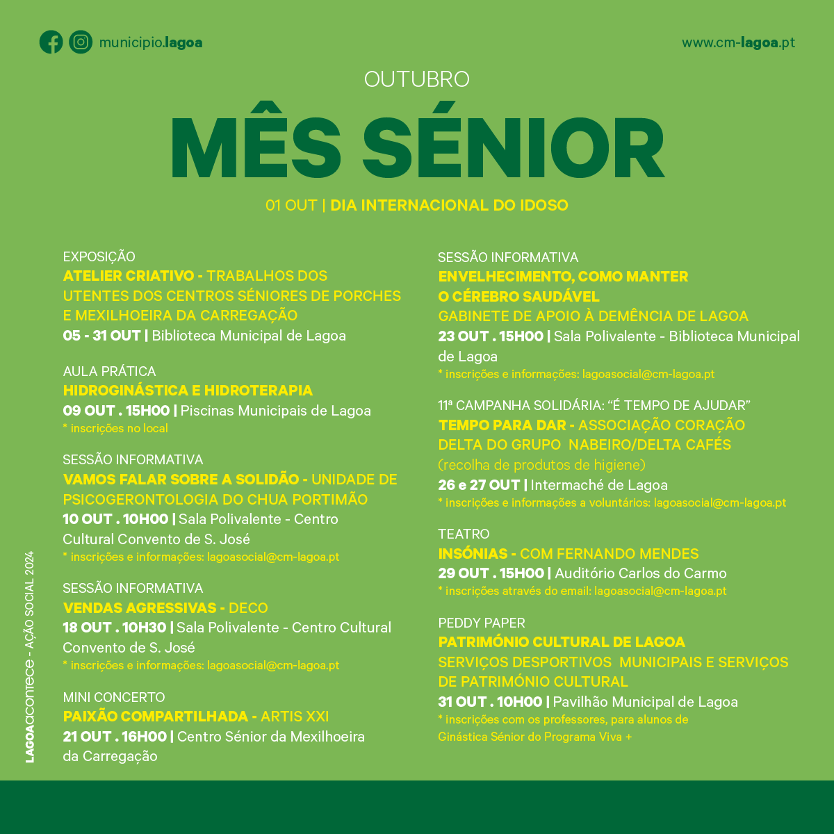 Durante o mês de outubro, o Municipio de Lagoa celebra o Mês Sénior, que inclui o dia 01 de outubro como o Dia Internacional ...Eventos | Ações de FormaçãoEventos | DesportivosEventos | LiteráriosEventos | Teatro