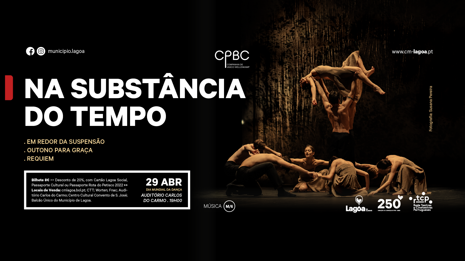 No Dia Mundial da Dança, o Auditório Carlos do Carmo recebe a Companhia Portuguesa de Bailado Contemporâneo, de Vasco Wellenkamp, com o espetáculo de dança “Na Substância do Tempo”. O espetáculo será no dia 29 de abril, pelas 19h00.