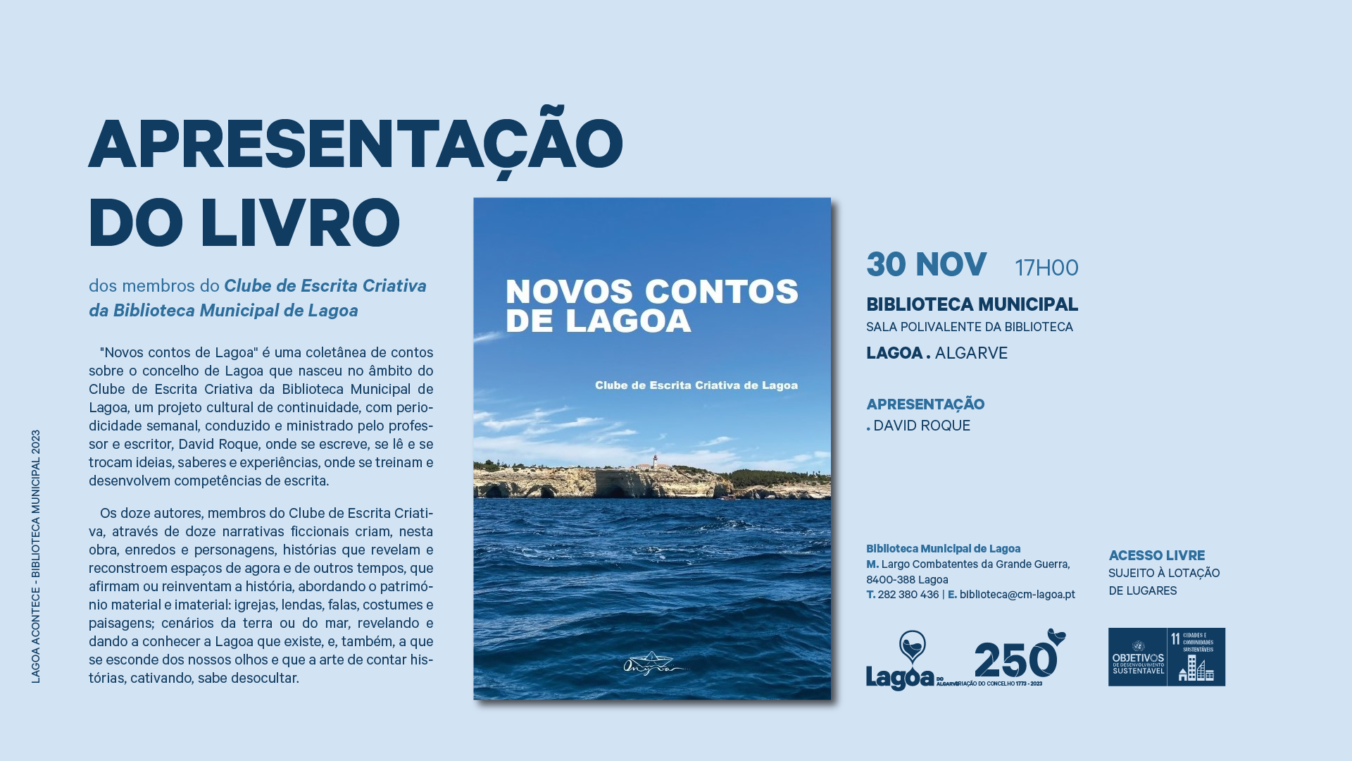 A Sala Polivalente da Biblioteca Municipal de Lagoa, recebe a Apresentação Pública do Livro “Novos contos de Lagoa”, dos membros do Clube de Escrita Criativa da Biblioteca Municipal de Lagoa, no próximo dia 30 de novembro, pelas 17h00 e a entrada é livre. A apresentação estará a cargo de David Roque.