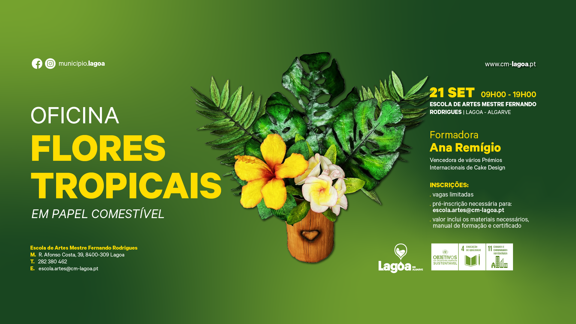 A Escola de Artes Mestre Fernando Rodrigues volta a apresentar mais uma oficina, desta vez será a 🎂“Oficina de Flores Tropicais em Papel Comestível”💐, mais uma vez com a Formadora Ana Remígio, vencedora de vários prémios internacionais de cake design. A oficina realiza-se no dia 21 de setembro, sendo necessária uma pré-inscrição! As vagas são limitadas.