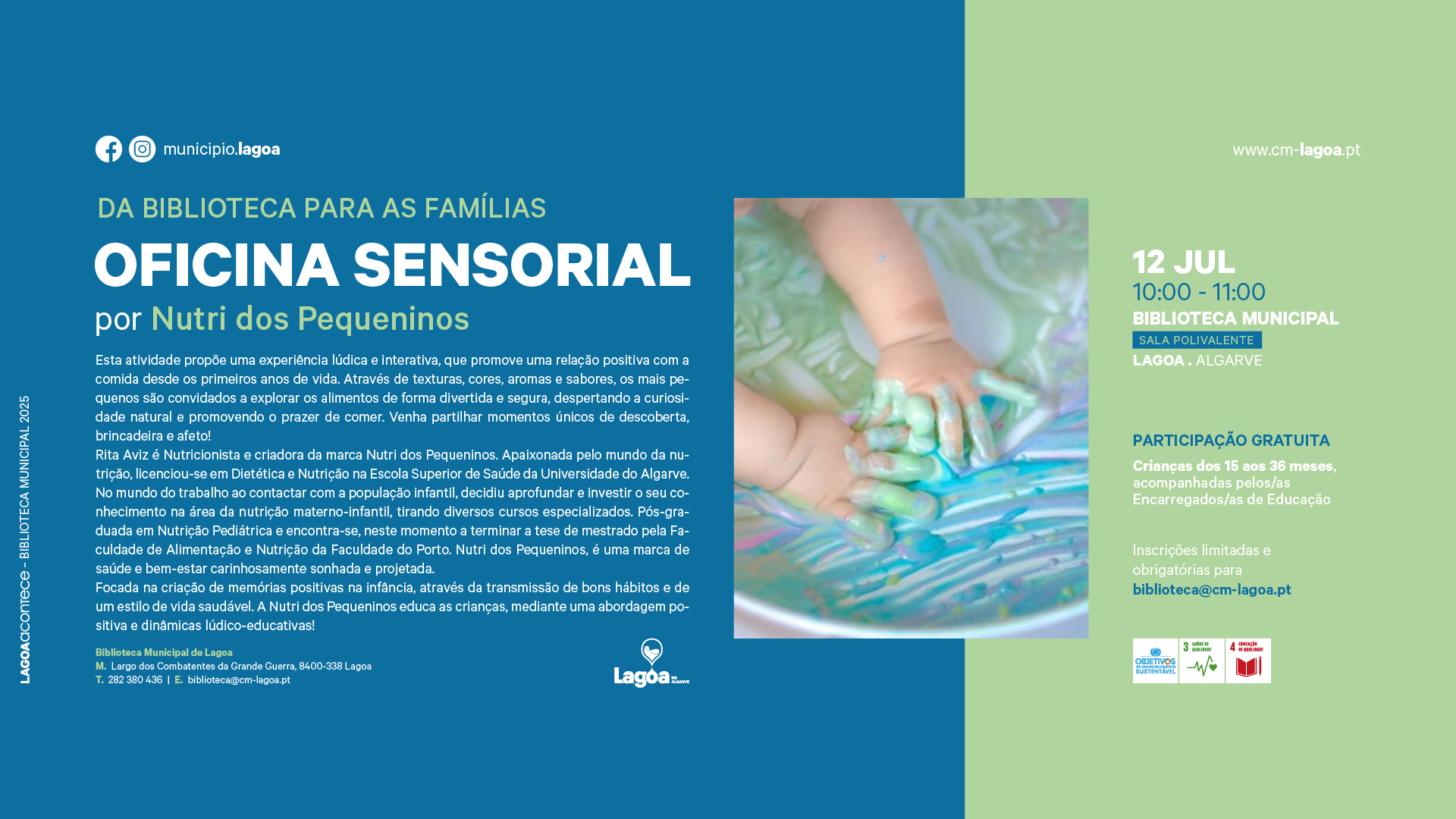 Sinopse: No dia 12 de julho pelas 10h00, a Biblioteca Municipal de Lagoa, recebe na sua rubrica mensal "Da Biblioteca para as famílias" a Oficina Sensorial, pela Nutri dos Pequeninos.