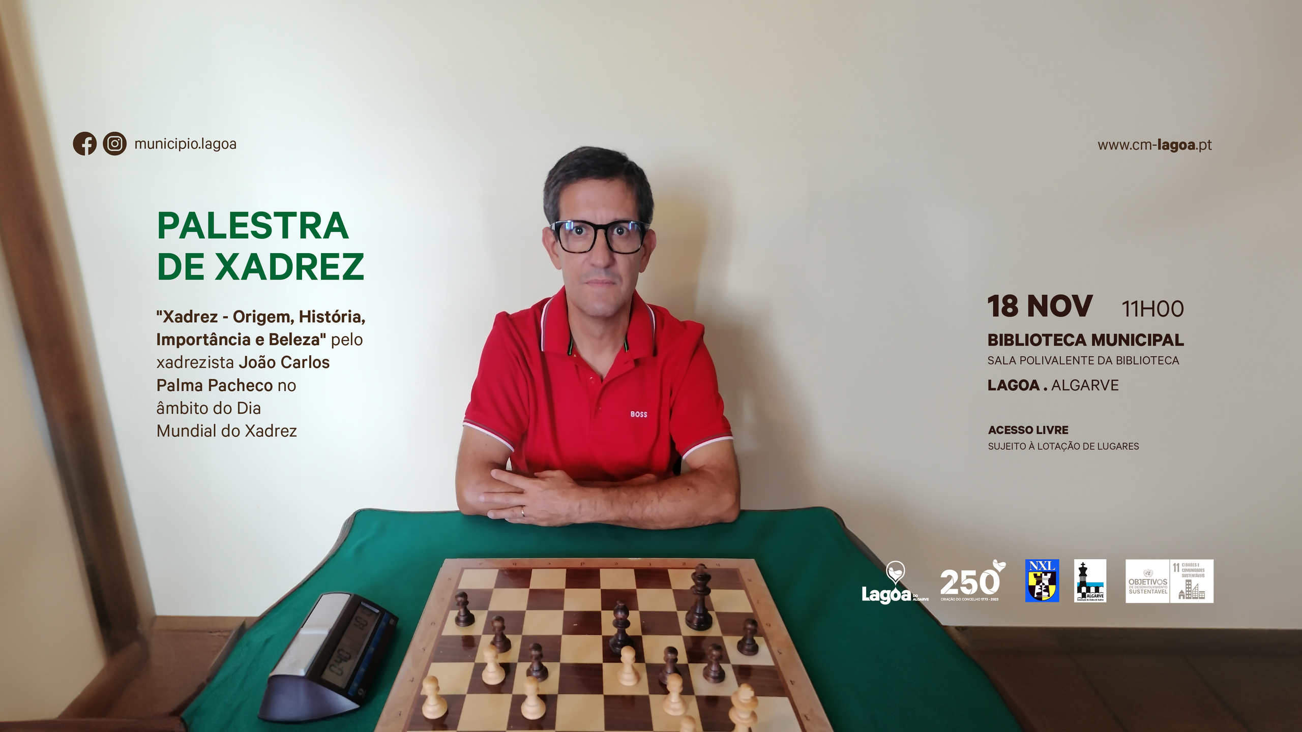 No âmbito do Dia Mundial do Xadrez, a Biblioteca Municipal de Lagoa recebe, no dia 18 de novembro, pelas 11h00, a Palestra de Xadrez “Xadrez – Origem, História, Importância e Beleza”, pela xadrezista João Carlos Palma Pacheco.