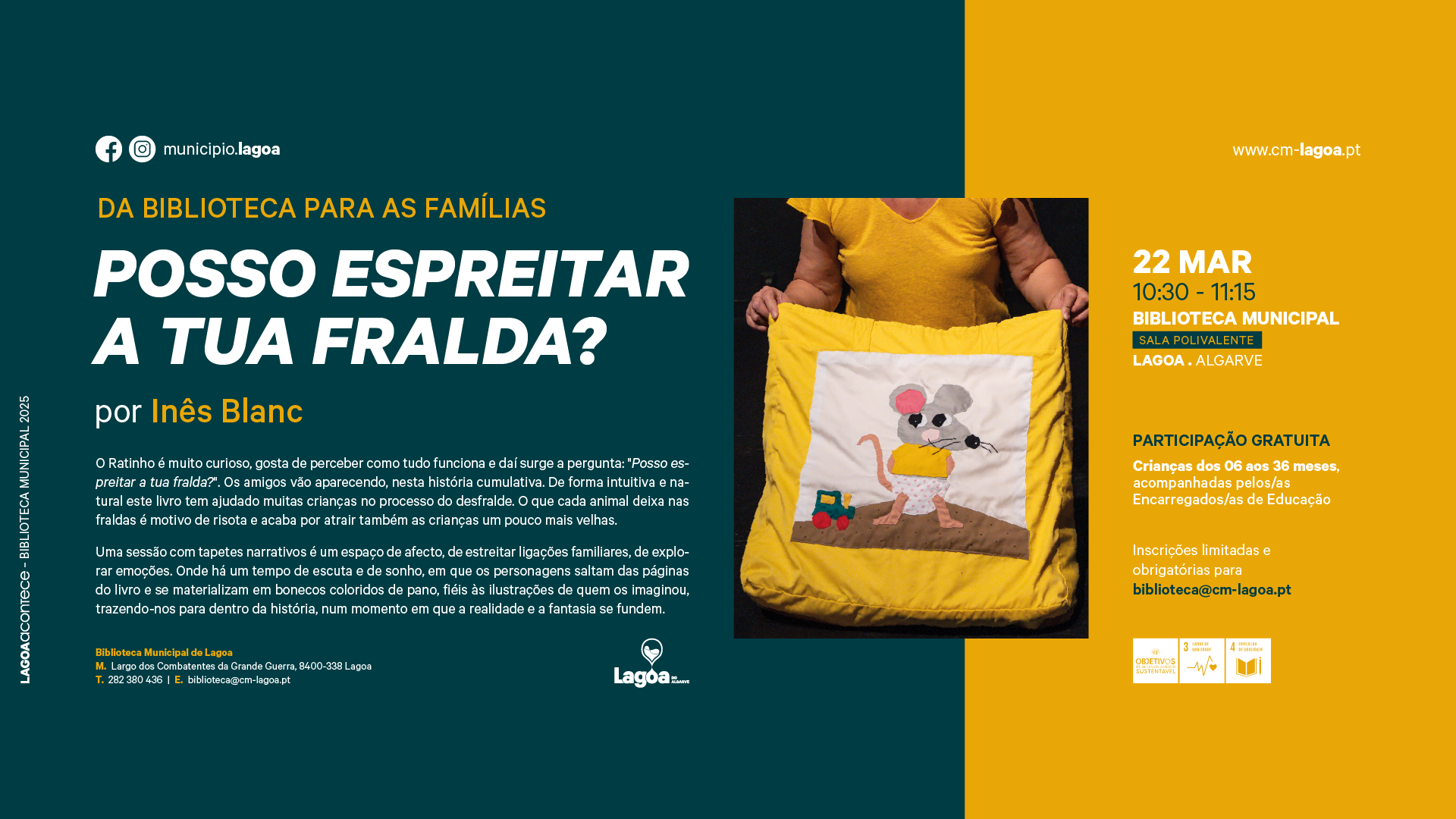 No dia 22 de março pelas 10h30, a Biblioteca Municipal de Lagoa, recebe na sua rubrica mensal 📖Da Biblioteca para as Famílias📚 a atividade: 👶Posso espreitar a tua fralda?🧷, por Inês Blanc.